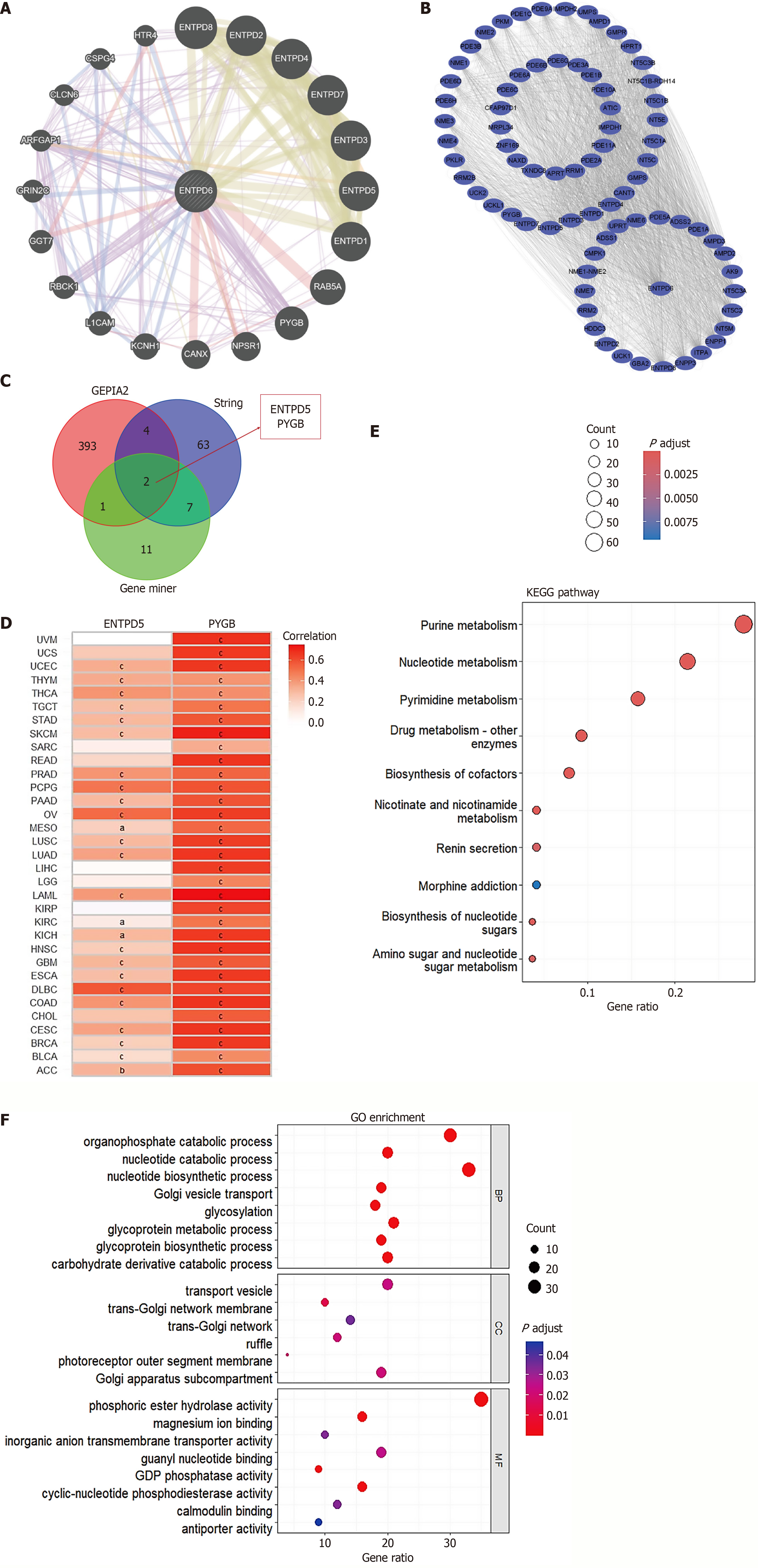 A: The ectonucleoside triphosphate diphosphohydrolase 6 (ENTPD6) interactome was generated with GeneMANIA; B: 76 putative ENTPD6-binding partners were retrieved from STRING; C: A Venn diagram highlights the genes shared by GeneMANIA, STRING, and Gene Expression Profiling Interactive Analysis; D: A pan-cancer heatmap illustrates the correlation between ENTPD6 and ENTPD5/glycogen phosphorylase B expression; E and F: Kyoto Encyclopedia of Genes and Genomes pathway and Gene Ontology enrichment analyses delineate the functional landscape of ENTPD6-associated genes. aP < 0.05; bP < 0.01; cP < 0.001. ENTPD5: Ectonucleoside triphosphate diphosphohydrolase 5; PYGB: Glycogen phosphorylase B; KEGG: Kyoto Encyclopedia of Genes; GO: Gene Ontology.