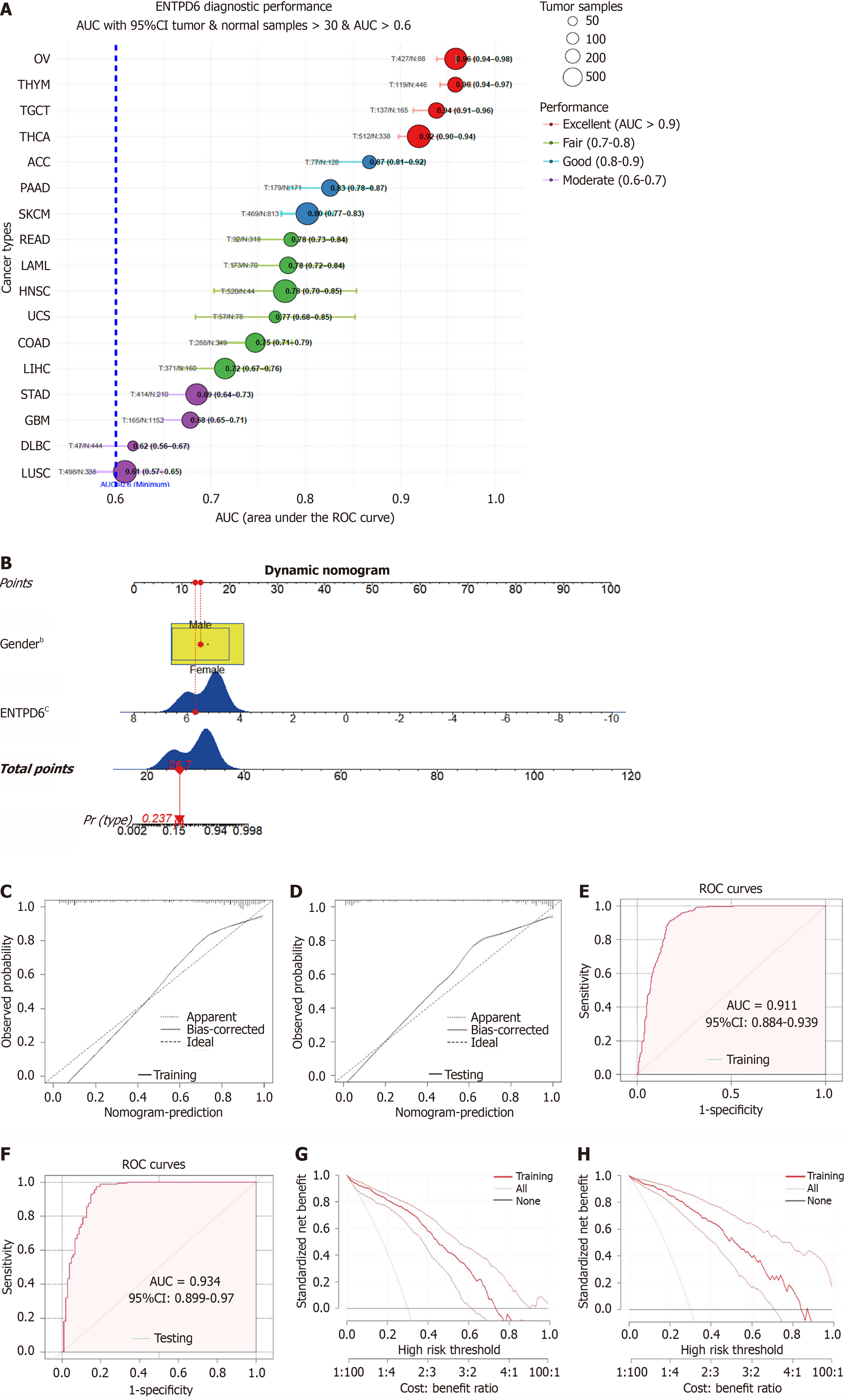 A: Receiver operating characteristic curve analysis revealed tumor types with area under the curve values > 0.6, based on the combined The Cancer Genome Atlas and Genotype-Tissue Expression databases; B: Risk factors of gender and ectonucleoside triphosphate diphosphohydrolase 6 expression were used to construct a nomogram in thyroid carcinoma; C and D: The calibration curves of the training and testing sets; E and F: The receiver operating characteristic analysis of the training and testing sets; G and H: The decision-curve analysis results of the training and testing sets. bP < 0.01, cP < 0.001. ENTPD6: Ectonucleoside triphosphate diphosphohydrolase 6; AUC: Area under the curve; CI: Confidence interval; ROC: Receiver operating characteristic.