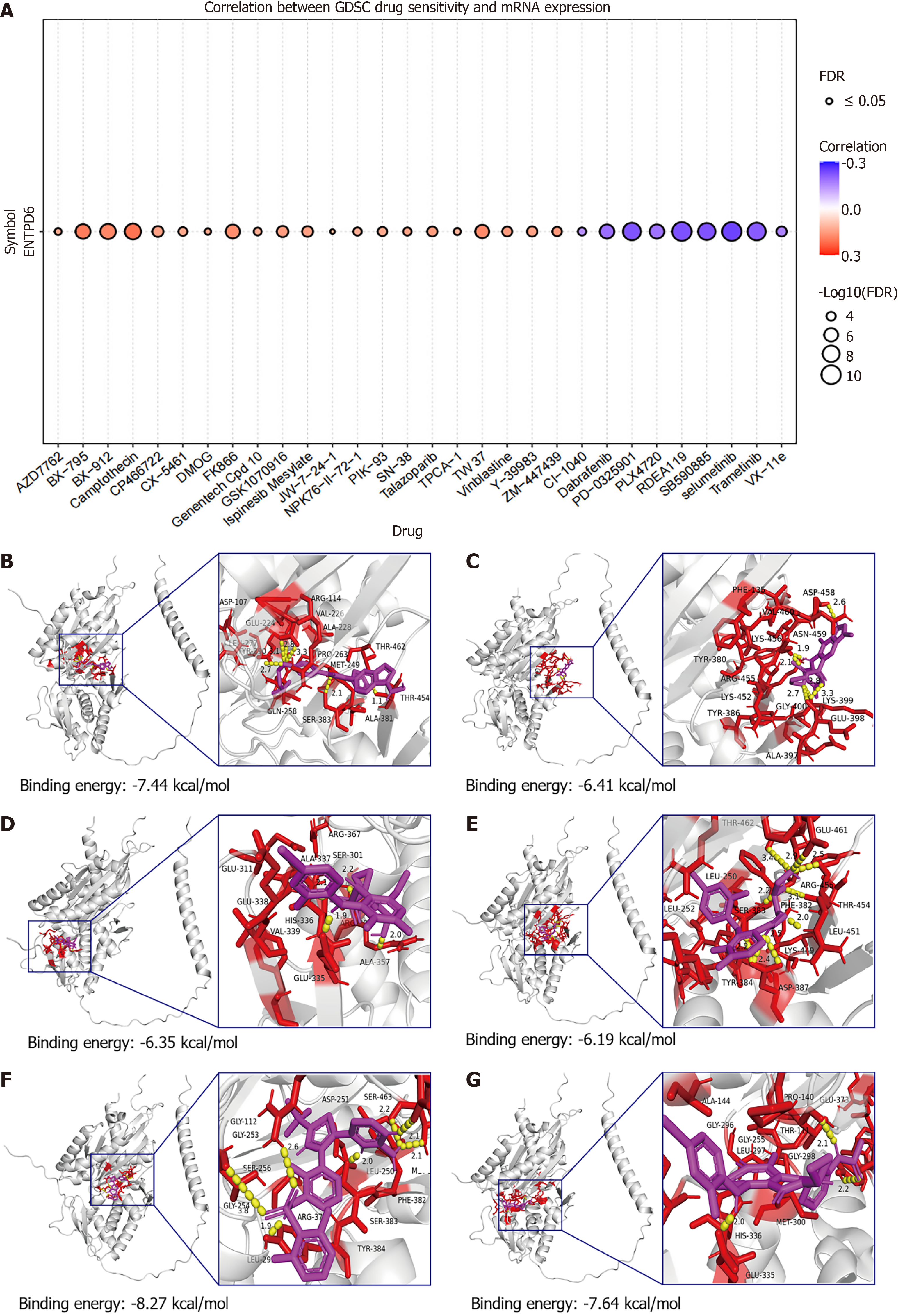 A: Drug-sensitivity profiling of ectonucleoside triphosphate diphosphohydrolase 6 (ENTPD6) was conducted online using the Gene Set Cancer Analysis platform; B-G: Molecular docking results of ENTPD6 protein with SB590885, selumetinib, RDEA119, PD-0325901, dabrafenib, and trametinib. Silvery white represents ENTPD6 protein, blue represents amino acid residue, yellow represents hydrogen atoms, and magenta represents drugs. GDSC: Genomics of Drug Sensitivity in Cancer; ENTPD6: Ectonucleoside triphosphate diphosphohydrolase 6; FDR: False discovery rate.