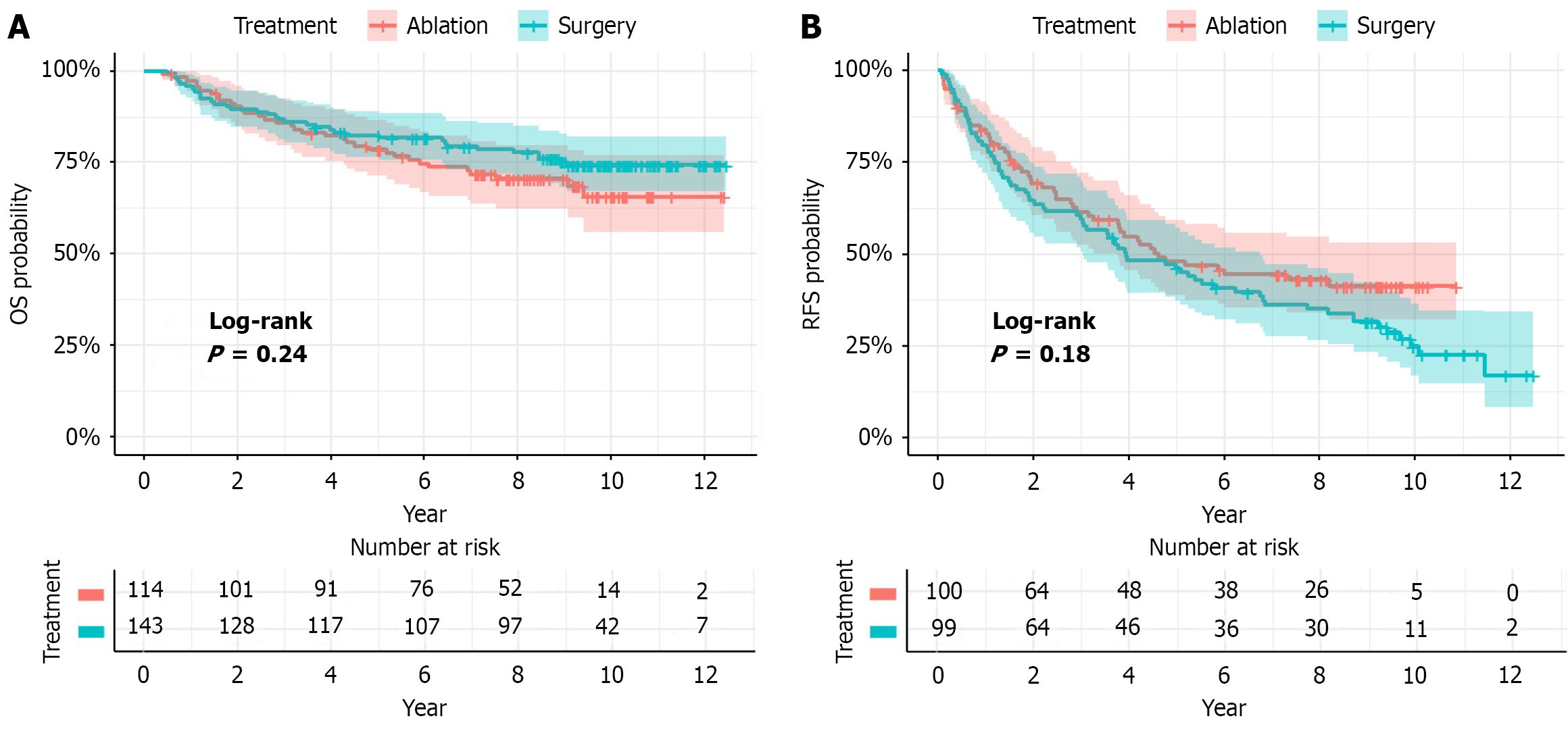 Figure 2 Kaplan-Meier curves for overall survival and recurrence-free survival in the surgical resection and thermal ablation groups.