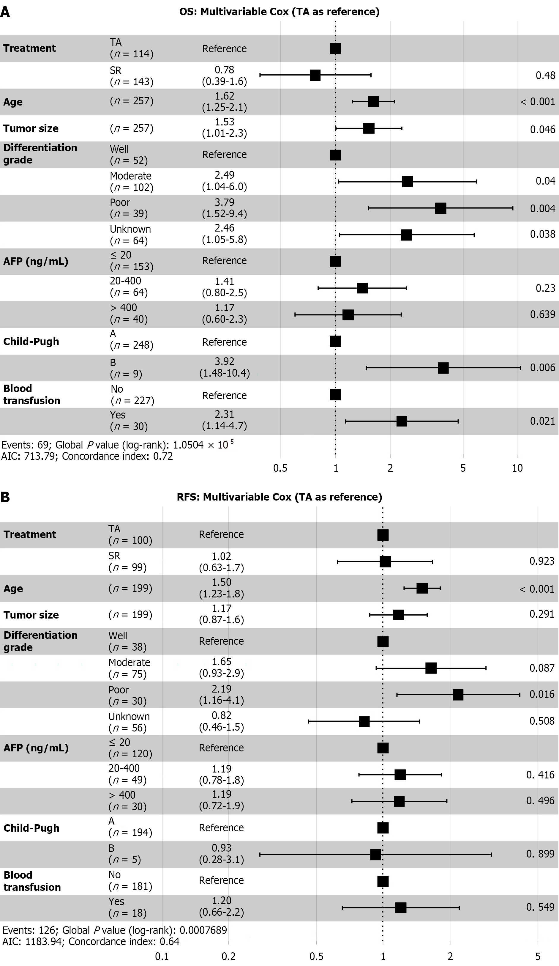 A: Overall survival; B: Recurrence-free survival. OS: Overall survival; TA: Thermal ablation; RFS: Recurrence-free survival; AFP: Alpha-fetoprotein; AIC: Akaike information criterion.