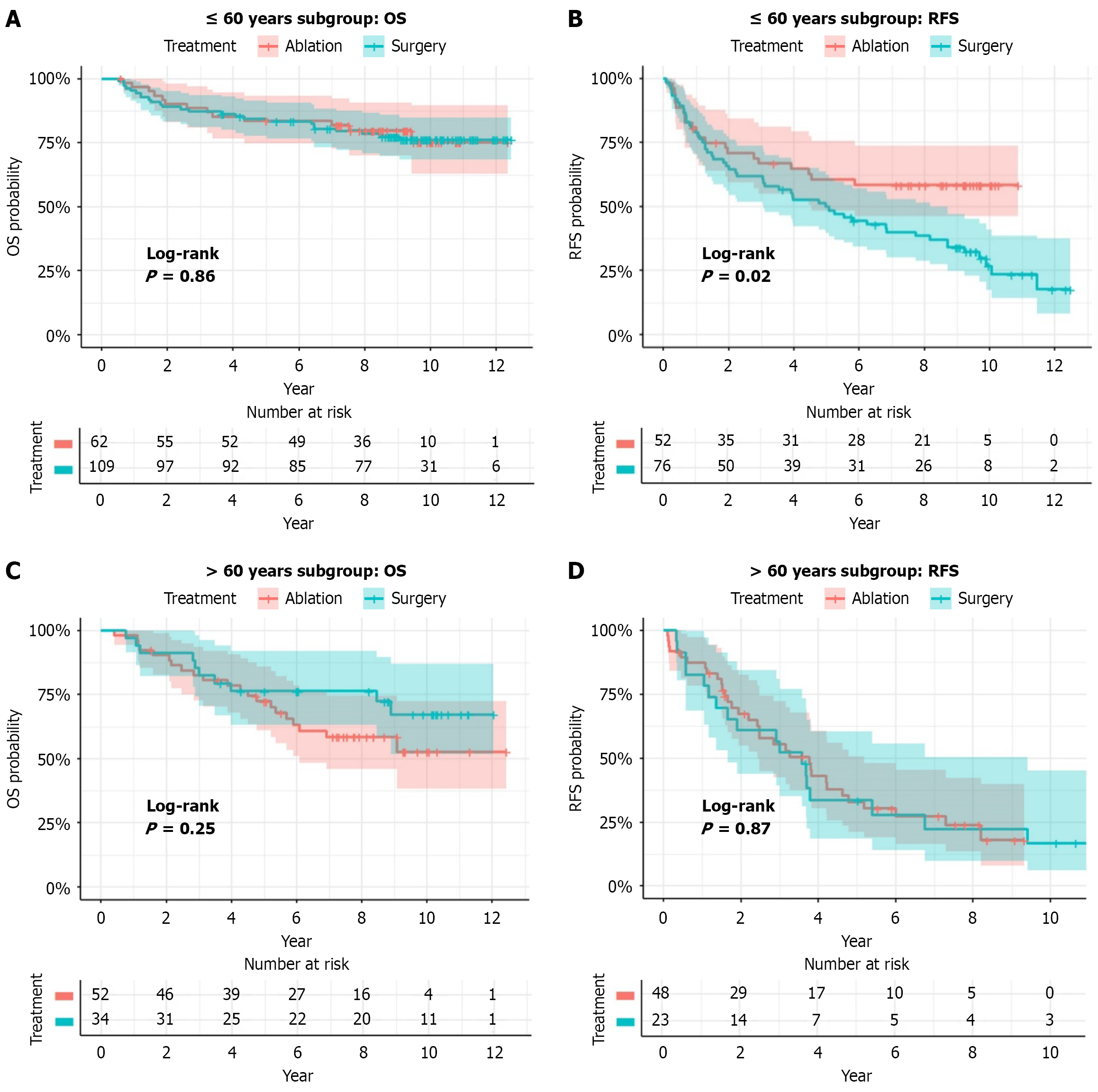 A: Overall survival for patients aged ≤ 60 years; B: Recurrence-free survival for patients aged ≤ 60 years; C: Overall survival for patients aged > 60 years; D: Recurrence-free survival for patients aged > 60 years. OS: Overall survival; RFS: Recurrence-free survival.