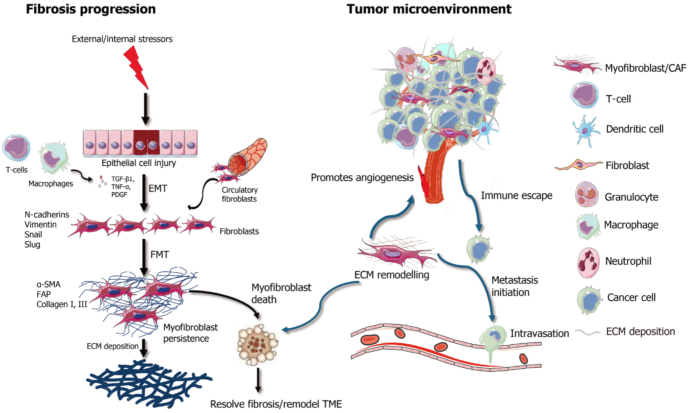 Left panel: Upon external or internal stressors, epithelial cell injury triggers epithelial-to-mesenchymal transition, mediated by inflammatory cytokines (e.g., transforming growth factor, tumor necrosis factor, platelet derived growth factor) released by immune cells such as macrophages. This leads to fibroblast activation through fibroblast-to-myofibroblast transition, marked by the expression of α-smooth muscle actin, fibroblast activator protein, and collagen I/III, which contribute to excessive extracellular matrix deposition. Persistent myofibroblast activation leads to fibrosis, in contrast inducing myofibroblast death could resolve fibrosis. Right panel: Within the tumor microenvironment, cancer-associated myofibroblasts promote tumor progression by enhancing angiogenesis, supporting immune evasion, initiating metastasis, and remodeling the excessive extracellular matrix. The cellular interactions involve multiple components, including T cells, macrophages, dendritic cells, and cancer cells. Myofibroblast depletion or reprogramming may thus serve as a therapeutic strategy to mitigate fibrosis and recondition the tumor microenvironment. TGF-β1: Transforming growth factor; TNF-α: Tumor necrosis factor α; PDGF: Platelet derived growth factor; EMT: Epithelial-to-mesenchymal transition; FMT: Fibroblast-to-myofibroblast transition; α-SMA: α-smooth muscle actin; FAP: Fibroblast activator protein; TME: Tumor microenvironment; ECM: Excessive extracellular matrix; CAF: Cancer-associated myofibroblast.