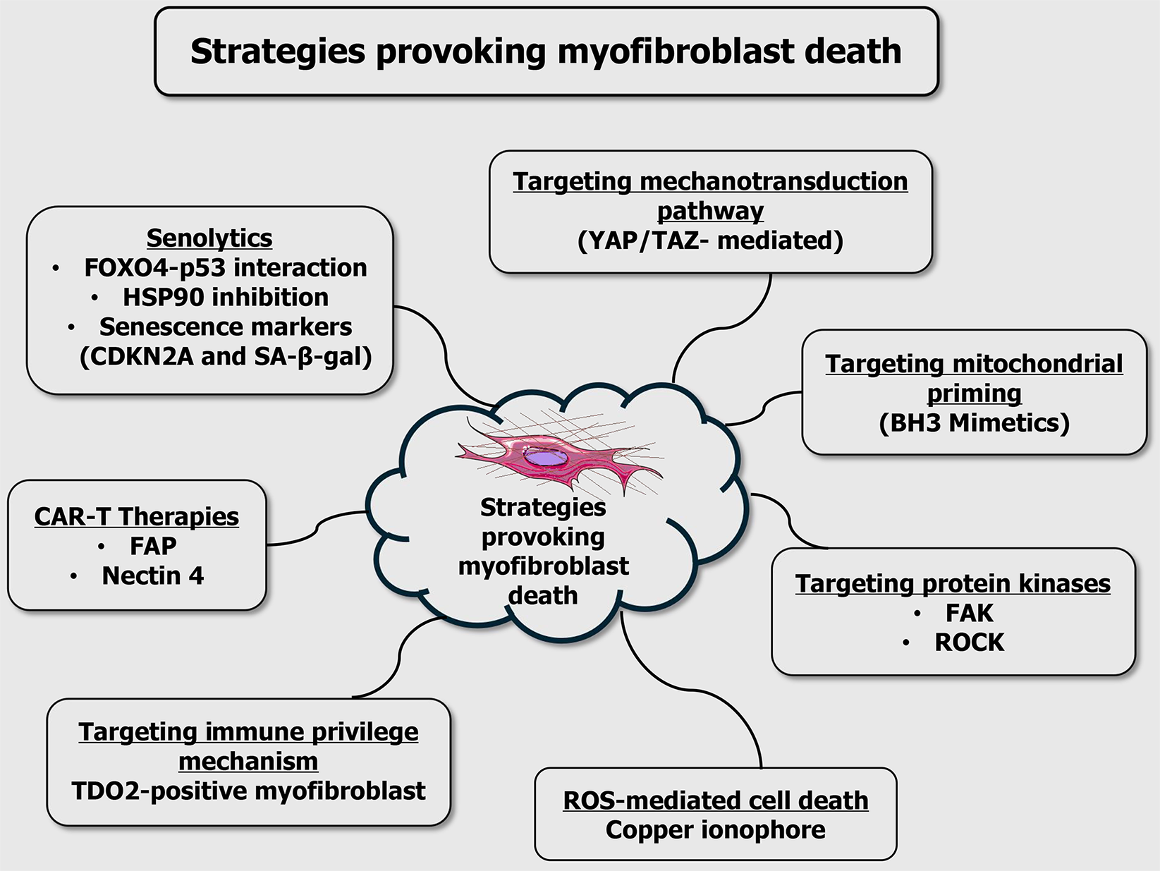 Key approaches include: (1) Senolytics: Elimination of senescent myofibroblasts by disrupting the forkhead box O4-p53 interaction, inhibiting heat shock protein 90, or targeting senescence markers like cyclin dependent kinase inhibitor 2A and senescence-associated β-galactosidase; (2) Chimeric antigen receptor T cell therapies: Engineered T cells targeting fibroblast-specific antigens such as fibroblast activation protein and nectin-4; (3) Immune privilege targeting: Disruption of immunosuppressive mechanisms, including tryptophan 2,3-dioxygenase-expressing myofibroblasts; (4) Mechanotransduction inhibition: Blocking Yes-associated protein and transcriptional coactivator with PDZ-binding motif signaling pathways that respond to extracellular matrix stiffness; (5) Mitochondrial priming: Sensitizing cells to apoptosis using BCL-2 homology 3 mimetics; (6) Protein kinase inhibition: Targeting focal adhesion kinase and Rho-associated coiled-coil containing protein kinase, which regulate cytoskeletal remodeling and survival signalling; and (7) Reactive oxygen species: Mediated cell death - induction of oxidative stress via agents such as copper ionophores. Collectively, these strategies offer promising avenues for the selective elimination of pathogenic myofibroblasts in fibrotic diseases and cancer. FOXO4: Forkhead box O4; HSP90: Heat shock protein 90; CDKN2A: Cyclin dependent kinase inhibitor 2A; SA-β-gal: Senescence-associated β-galactosidase; CAR-T: Chimeric antigen receptor T; FAP: Fibroblast activation protein; TDO2: Tryptophan 2,3-dioxygenase; YAP/TAZ: Yes-associated protein and transcriptional coactivator with PDZ-binding motif; BH3: B-cell lymphoma 2 homology 3; FAK: Focal adhesion kinase; ROCK: Rho-associated coiled-coil containing protein kinase; ROS: Reactive oxygen species.