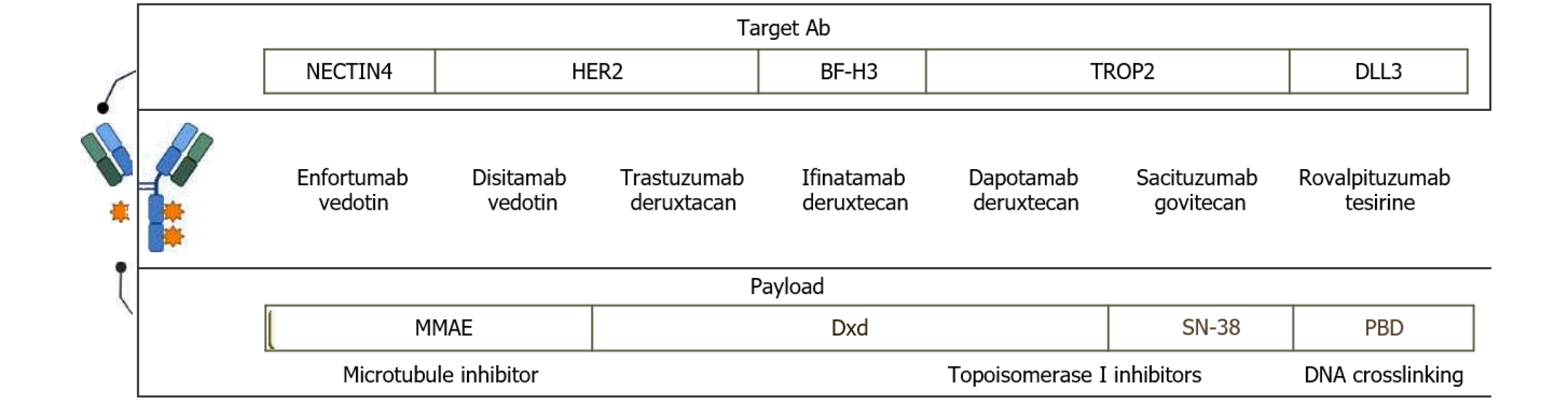 The antibody-drug conjugates (ADCs) are categorized according to their antigen specificity, including anti-NECTIN4, anti-HER2, anti-B7-H3, anti-TROP2, and anti-DLL3. Each ADC is listed alongside its corresponding payload, which is color-coded according to its mechanism of action: Microtubule inhibitors, topoisomerase I inhibitors (Dxd, SN-38), and DNA crosslinking agents. MMAE: Monomethyl auristatin E; Dxd: Deruxtecan; PBD: Pyrrolobenzodiazepine.