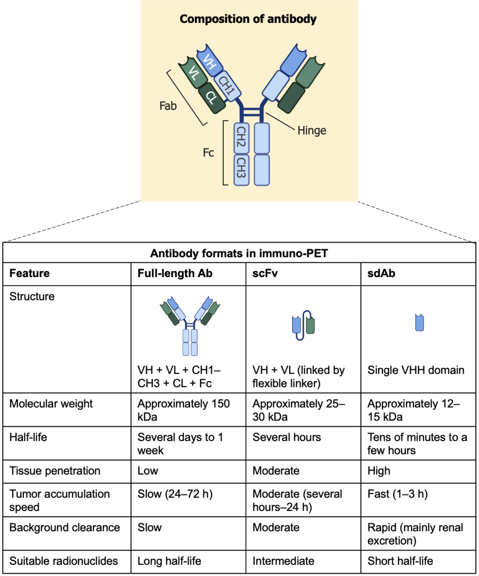 Figure 2 was in part created in BioRender. Luanpitpong, S. (2025) https://BioRender.com/ymggrq9. Ab: Antibody; scFv: Single-chain variable fragment; sdAb: Single-domain antibody; VH: Variable region of the heavy chain; VL: Variable region of the light chain; CH: Constant region of the heavy chain; CL: Constant region of the light chain; VHH: Variable domain of the heavy chain of the heavy-chain-only antibody; Immuno-PET: Immuno-positron emission tomography.