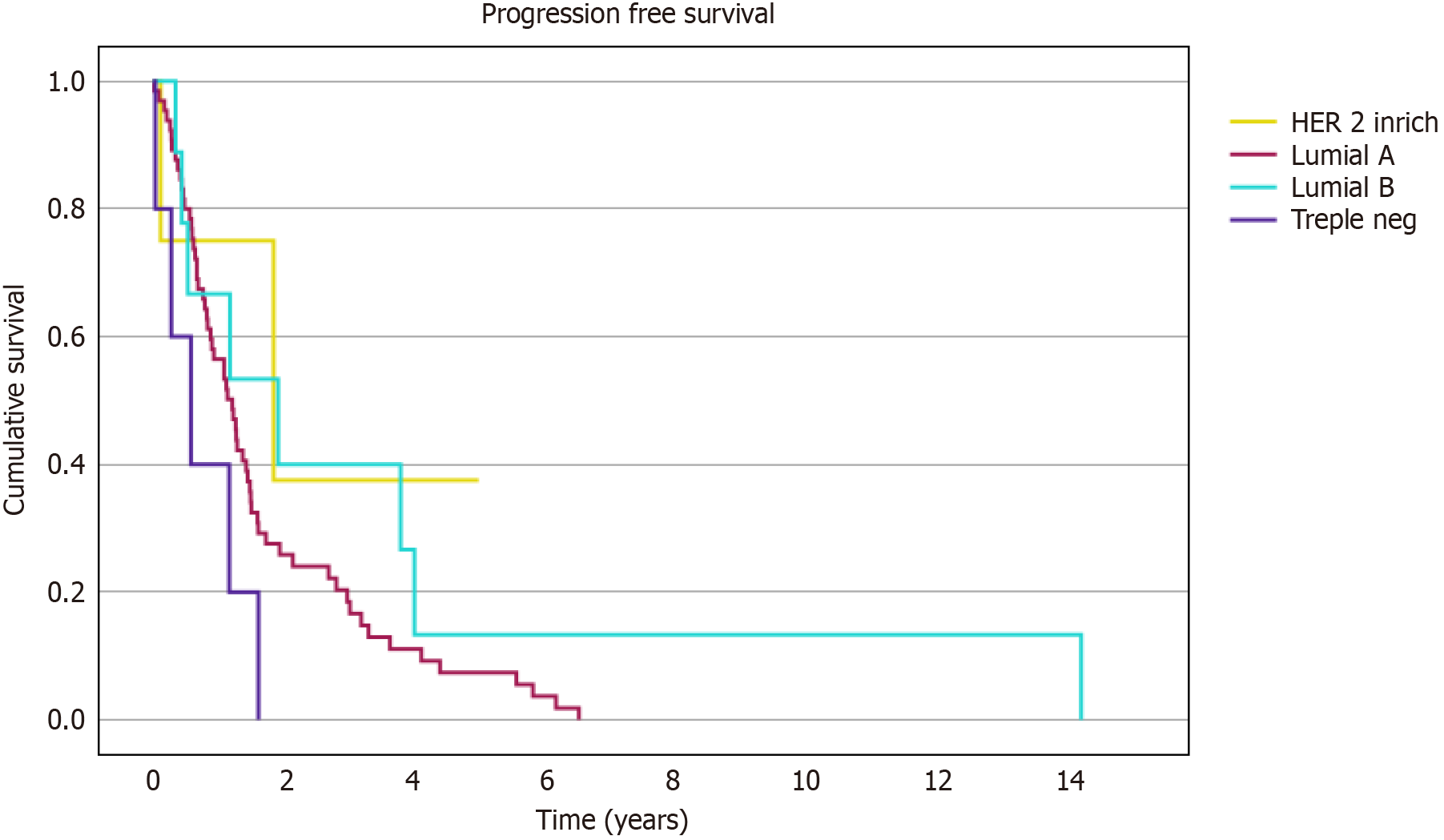Kaplan-Meier curve describing progression-free interval according to histological subtypes.