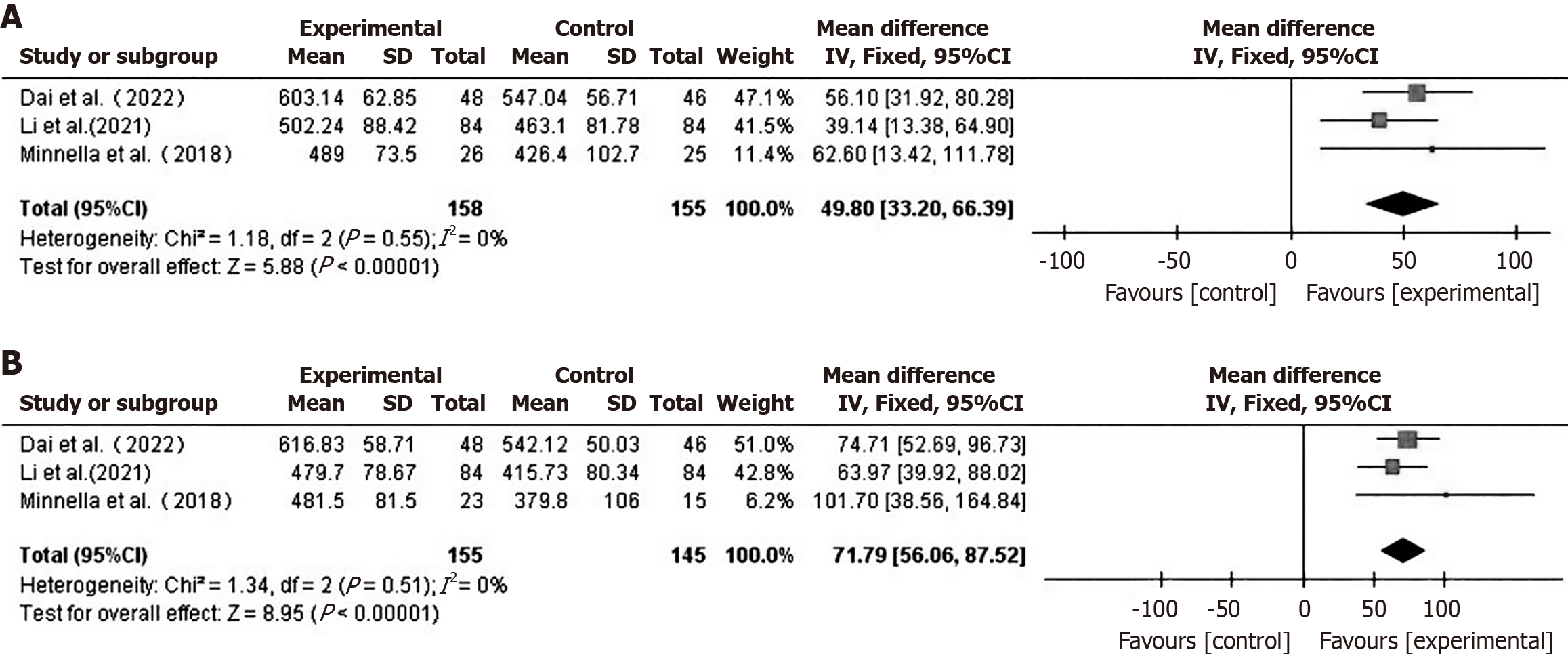 Figure 2 Forest plot comparing preoperative six-minute walk distance (A) and postoperative six-minute walk distance (B) between the two groups.