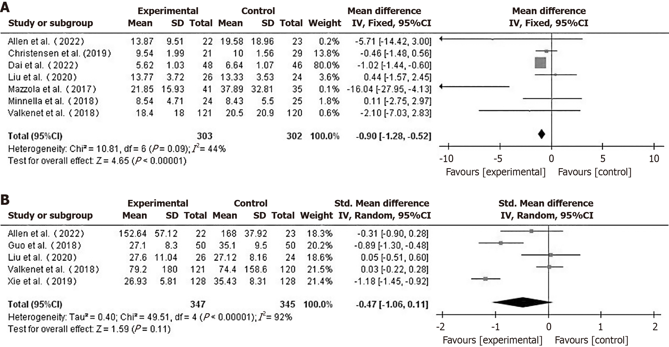 Figure 7 Forest plot comparing preoperative albumin (A) and albumin levels one week post-operatively (B) between the two groups.