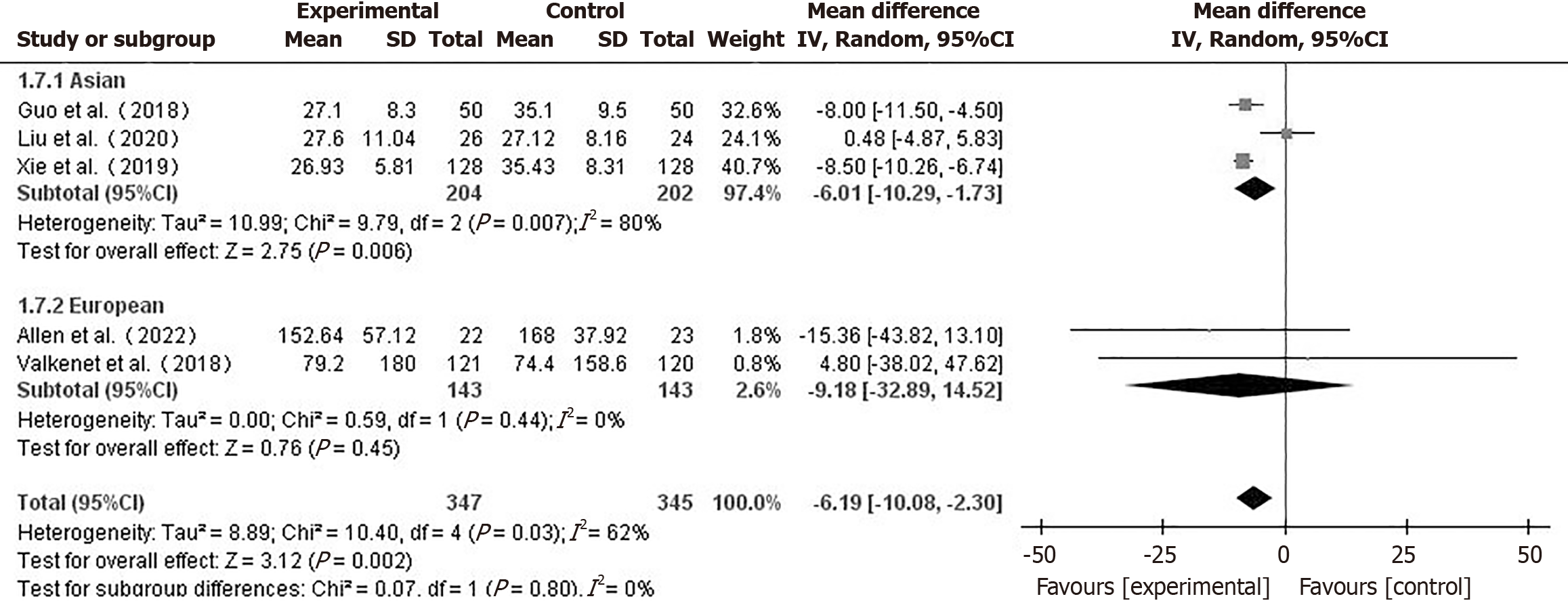 Figure 5 Forest plot for the subgroup analysis by geographic region of intensive care unit care durations between the two groups.
