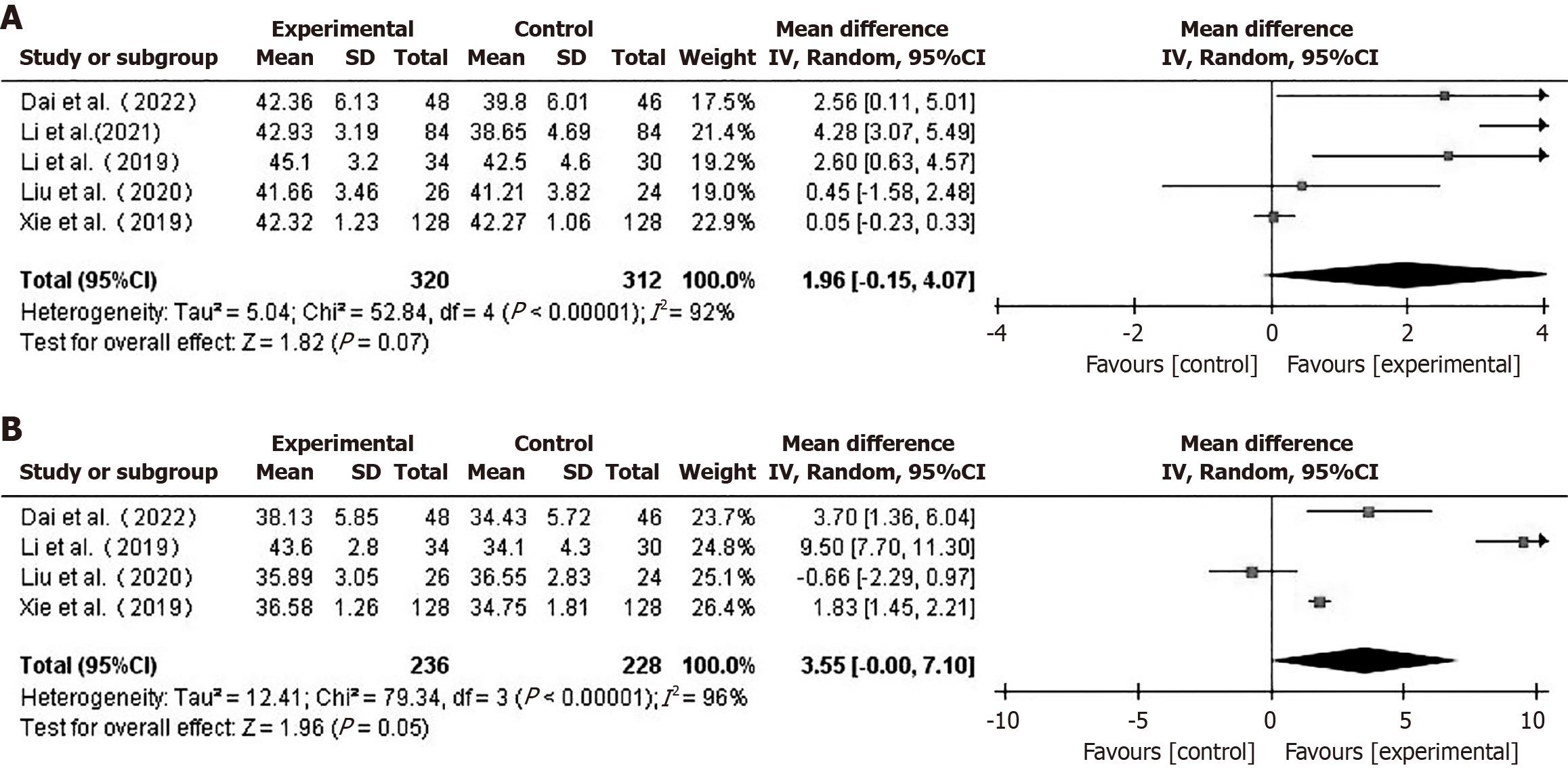 Figure 4 Forest plot comparing hospital stay durations (A) and intensive care unit care durations (B) between the two groups.