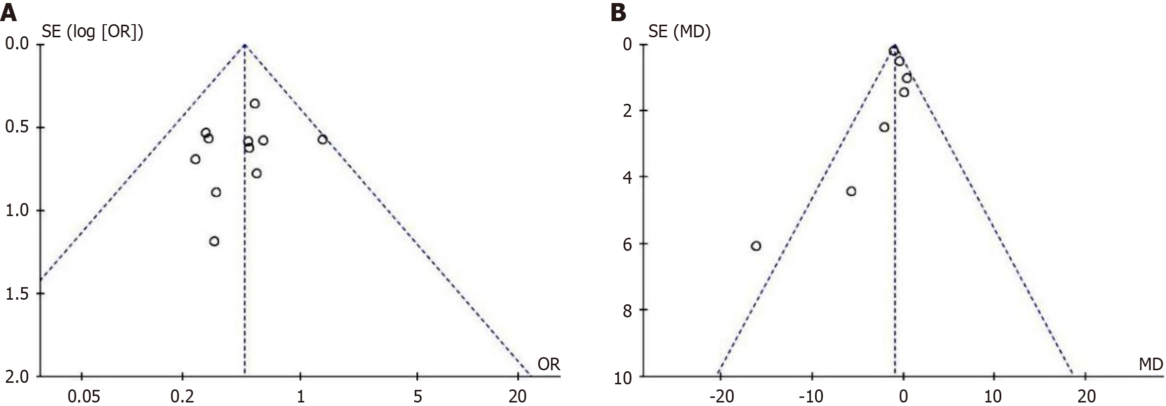 A: Funnel plot of publication bias for the odds ratio estimates; B: Funnel plot of publication bias for the mean difference estimates. OR: Odds ratio.