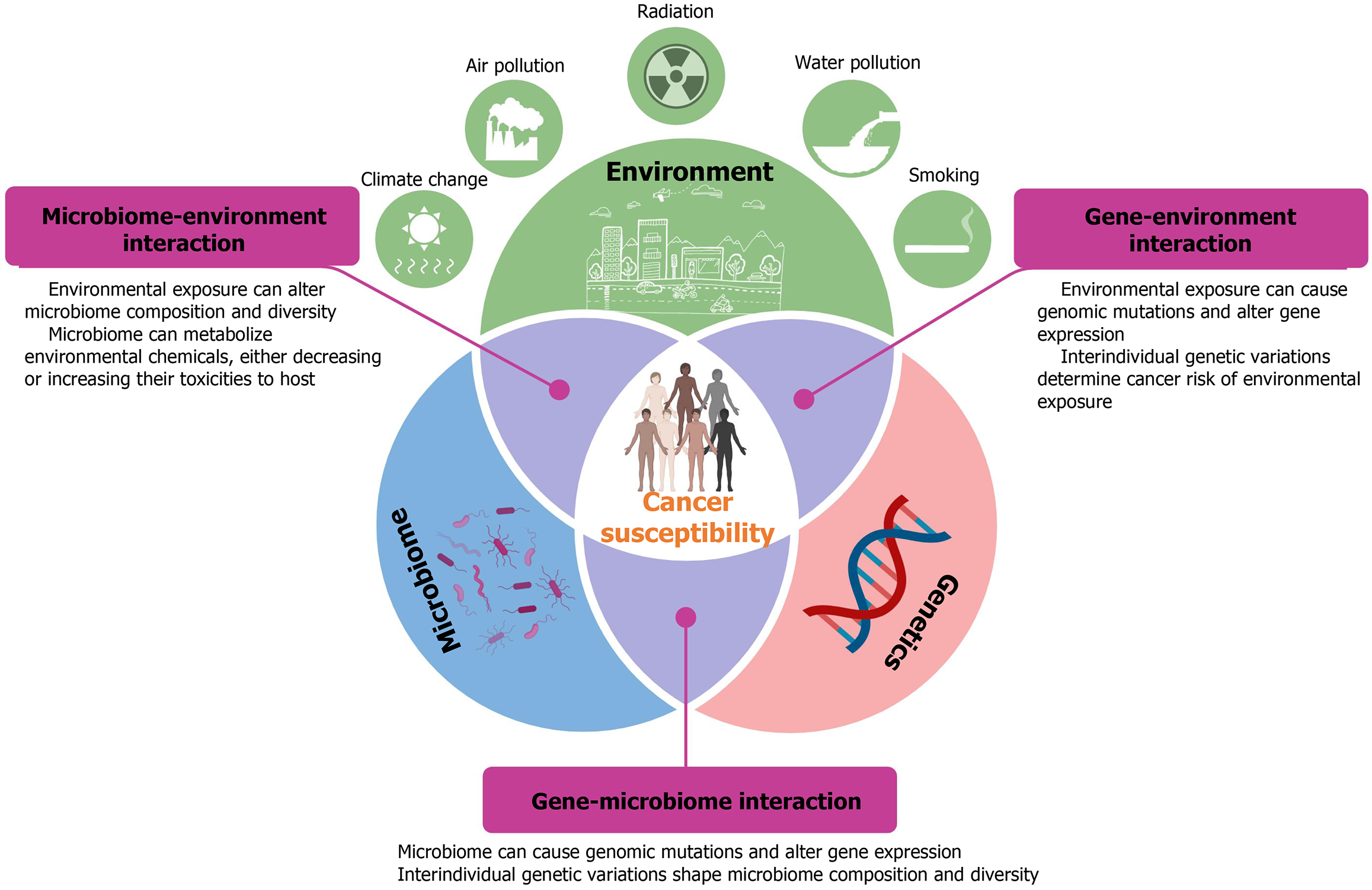 The host gene-environment, host gene-microbiome, and microbiome-environment bidirectional interactions play critical roles in cancer susceptibility.