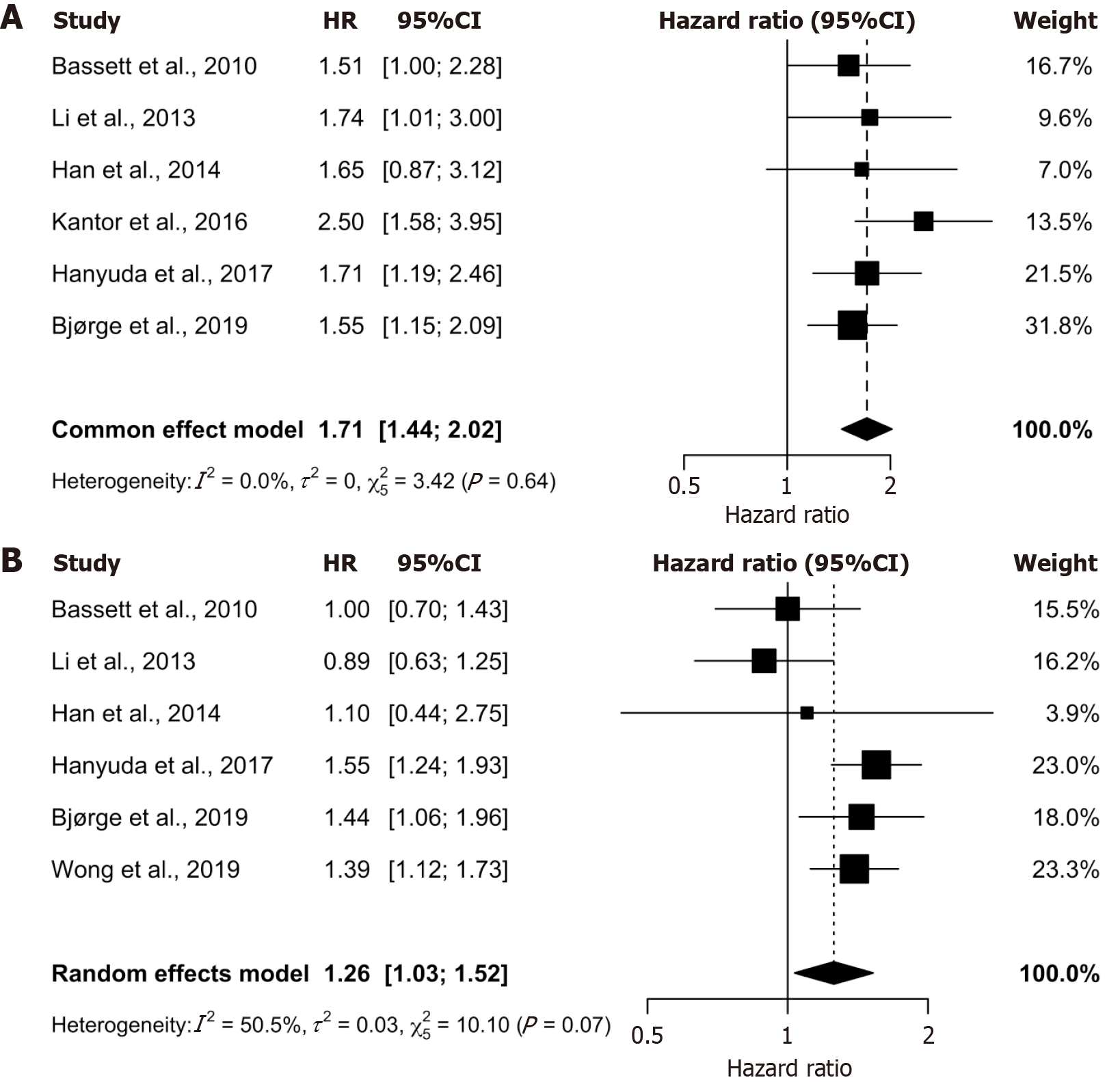 A: Pooled analysis for men shows a strong, statistically significant positive association (HR 1.71, 95%CI: 1.44-2.02) with no observed heterogeneity (I2 = 0.0%); B: Pooled analysis for women indicates a significant but attenuated positive association (HR 1.26, 95%CI: 1.03-1.52) with moderate heterogeneity (I2 = 50.5%).