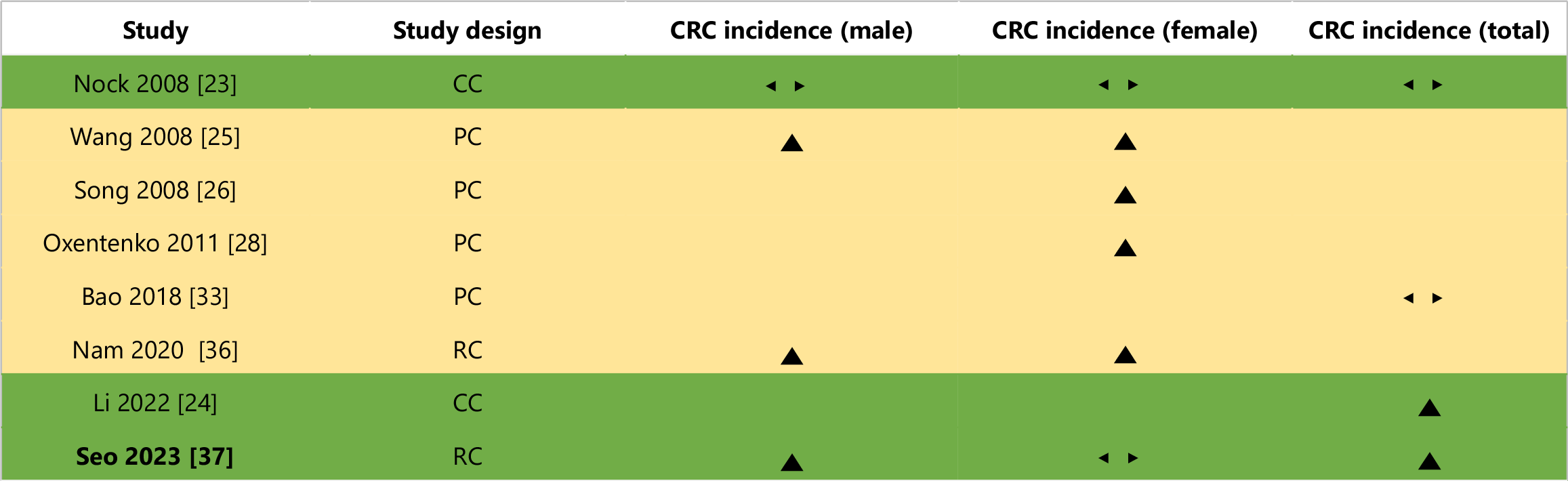 Effect direction: ▲ = Positive health impact, ▼ = Negative health impact, ◄► = No change/mixed effects/conflicting findings. Sample size: Final sample size (individuals) in intervention group large arrow ▲ > 300; medium arrow ▲ 50-300; small arrow ▲ < 50. Study quality: Denoted by row colour: Green = Low risk of bias; amber = Some concerns; red = High risk of bias. CC: Case-control; PC: Prospective cohort; RC: Retrospective cohort.