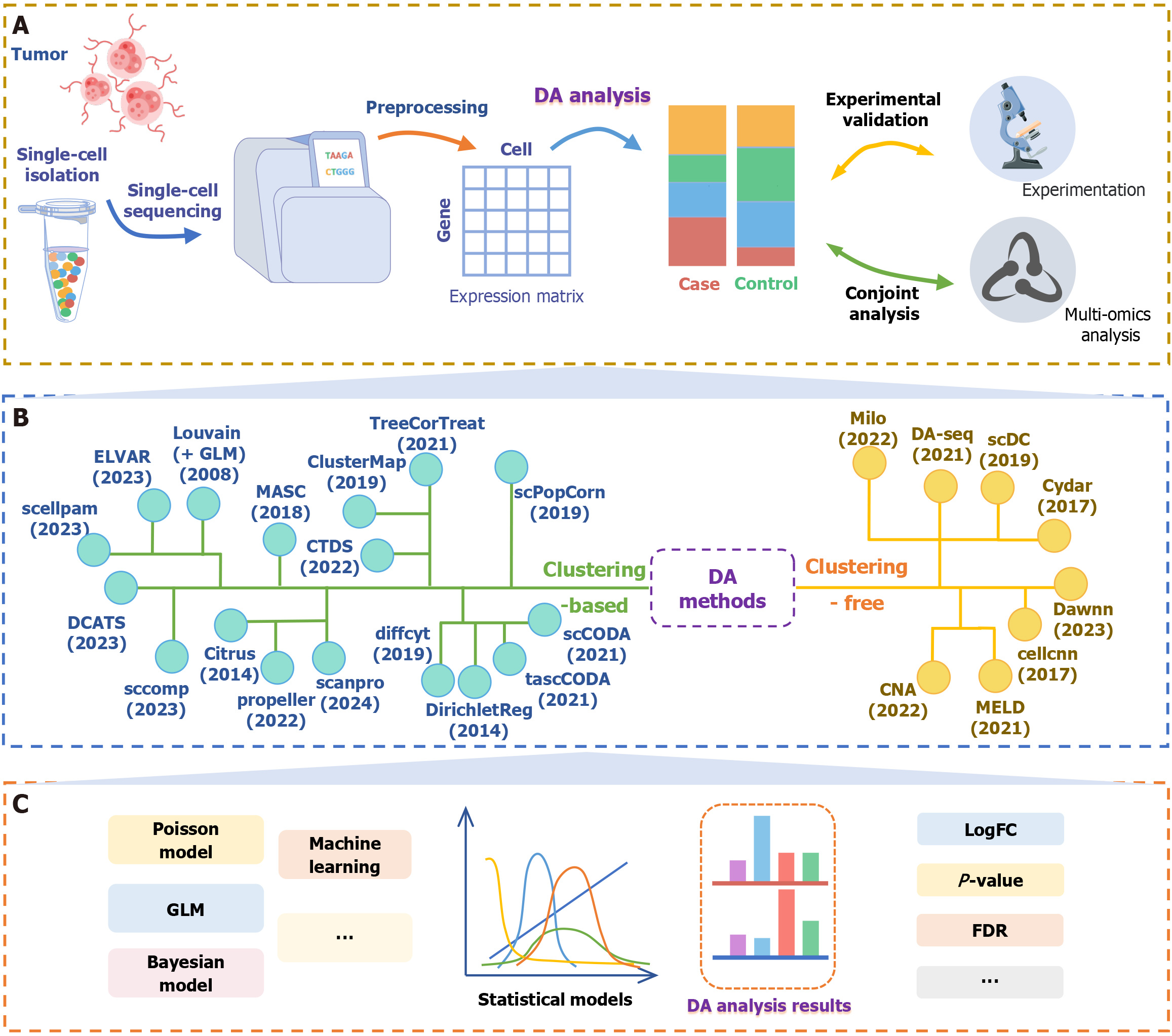 A: The general workflow of single-cell differential abundance (DA) analysis. Data obtained from single-cell sequencing are preprocessed and then subjected to DA detection. The results of DA detection are often validated experimentally or integrated with multi-omics data to facilitate deeper insights into the dataset; B: Single-cell DA methods can be broadly categorized based on whether they rely on clustering strategies; C: Common statistical models and typical output metrics used in single-cell DA detection. DA: Differential abundance; GLM: Generalized linear models; logFC: Log2 fold change; FDR: False discovery rate.