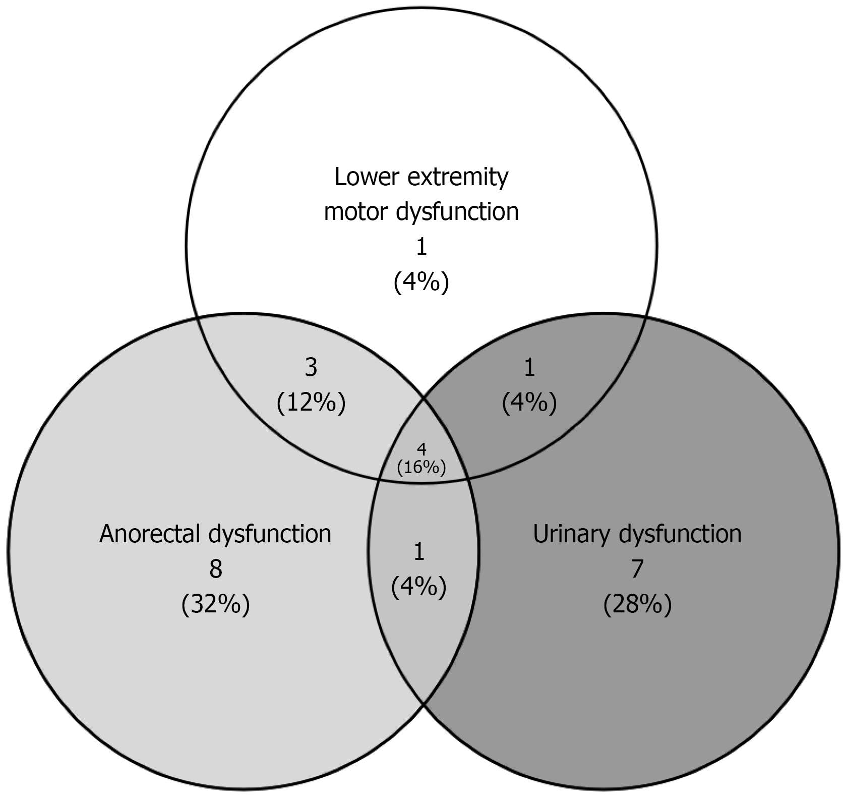 Figure 4 Venn diagram of postoperative dysfunction in adults with mature cystic sacrococcygeal treat.