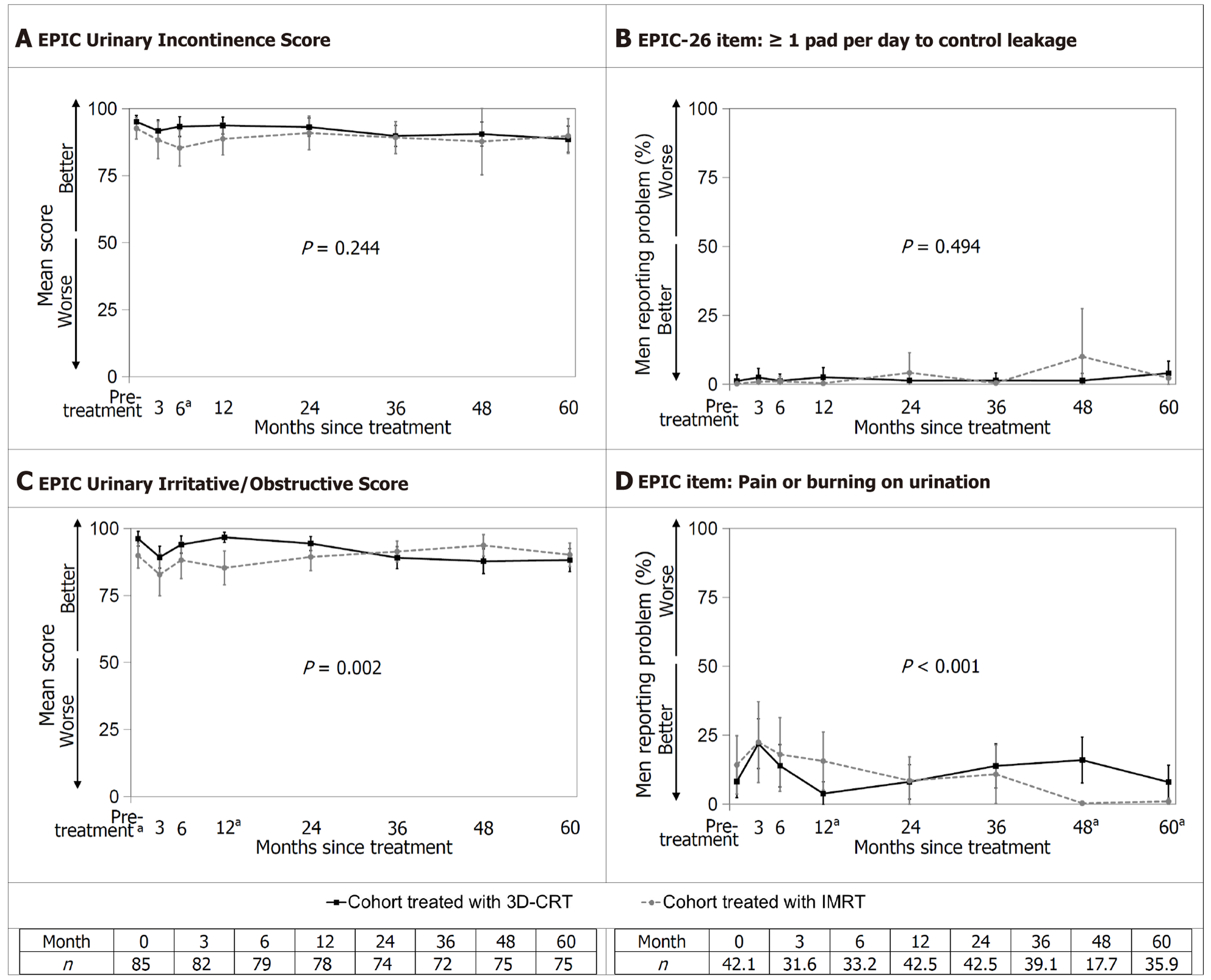A: Expanded prostate cancer index composite (EPIC)-26 Urinary Incontinence Score; B: EPIC-26 item “≥ 1 pad per day to control leakage”; C: EPIC-26 Urinary Irritative/Obstructive Score; D: EPIC-26 item “pain or burning on urination”. Urinary outcomes over 60 months. Error bars represent 95%CI. The P value for the interaction between treatment and time is shown; aP < 0.05 for the t-test at that assessment when the treatment-by-time interaction is significant. EPIC: Expanded prostate cancer index composite; IMRT: Intensity-modulated radiotherapy; 3D-CRT: Three-dimensional conformal radiotherapy.
