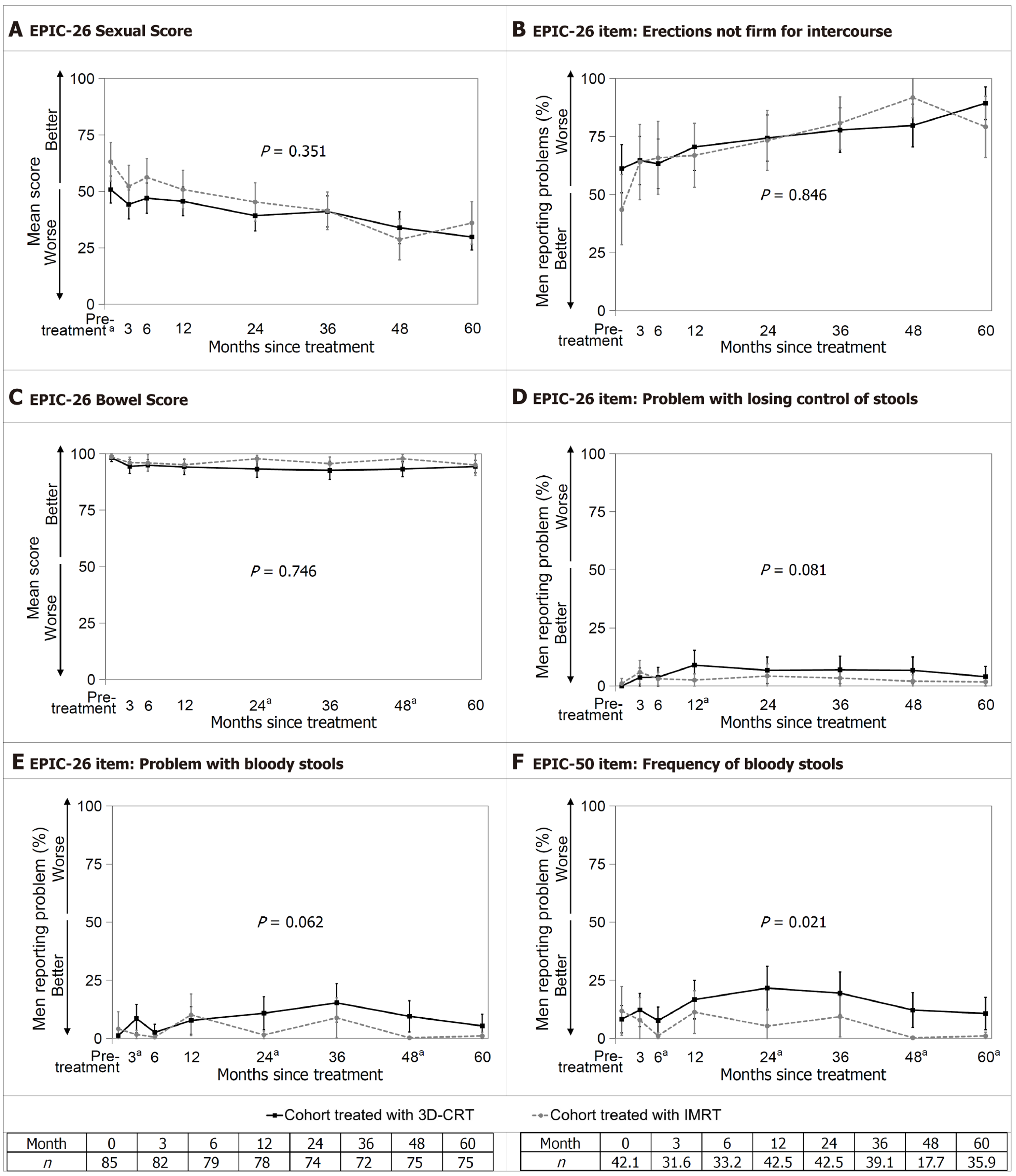 A: Expanded prostate cancer index composite (EPIC)-26 Sexual Score; B: EPIC-26 item “erections not firm for intercourse”; C: EPIC-26 Bowel Score; D: EPIC-26 item “problem with losing control of stools”; E: EPIC-26 item “problem with bloody stools”; F: EPIC-50 item “frequency of bloody stools”. Sexual and bowel outcomes over 60 months. Error bars represent 95%CI. The P value for the interaction between treatment and time is shown; aP < 0.05 for the t-test at that assessment when the treatment-by-time interaction is significant. EPIC: Expanded prostate cancer index composite; IMRT: Intensity-modulated radiotherapy; 3D-CRT: Three-dimensional conformal radiotherapy.