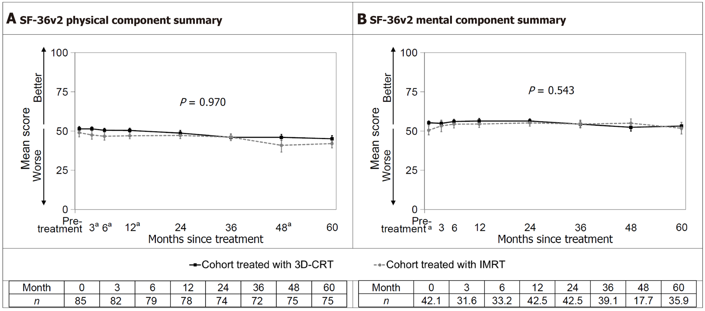 A: Short form-36 health survey version 2 physical component summary; B: Short form-36 health survey version 2 mental component summary. Health-related quality of life over 60 months. Error bars represent 95%CI. The P value for the interaction between treatment and time is shown; aP < 0.05 for the t-test at that assessment when the treatment-by-time interaction is significant. SF-36: Short form-36 health survey; IMRT: Intensity-modulated radiotherapy; 3D-CRT: Three-dimensional conformal radiotherapy.