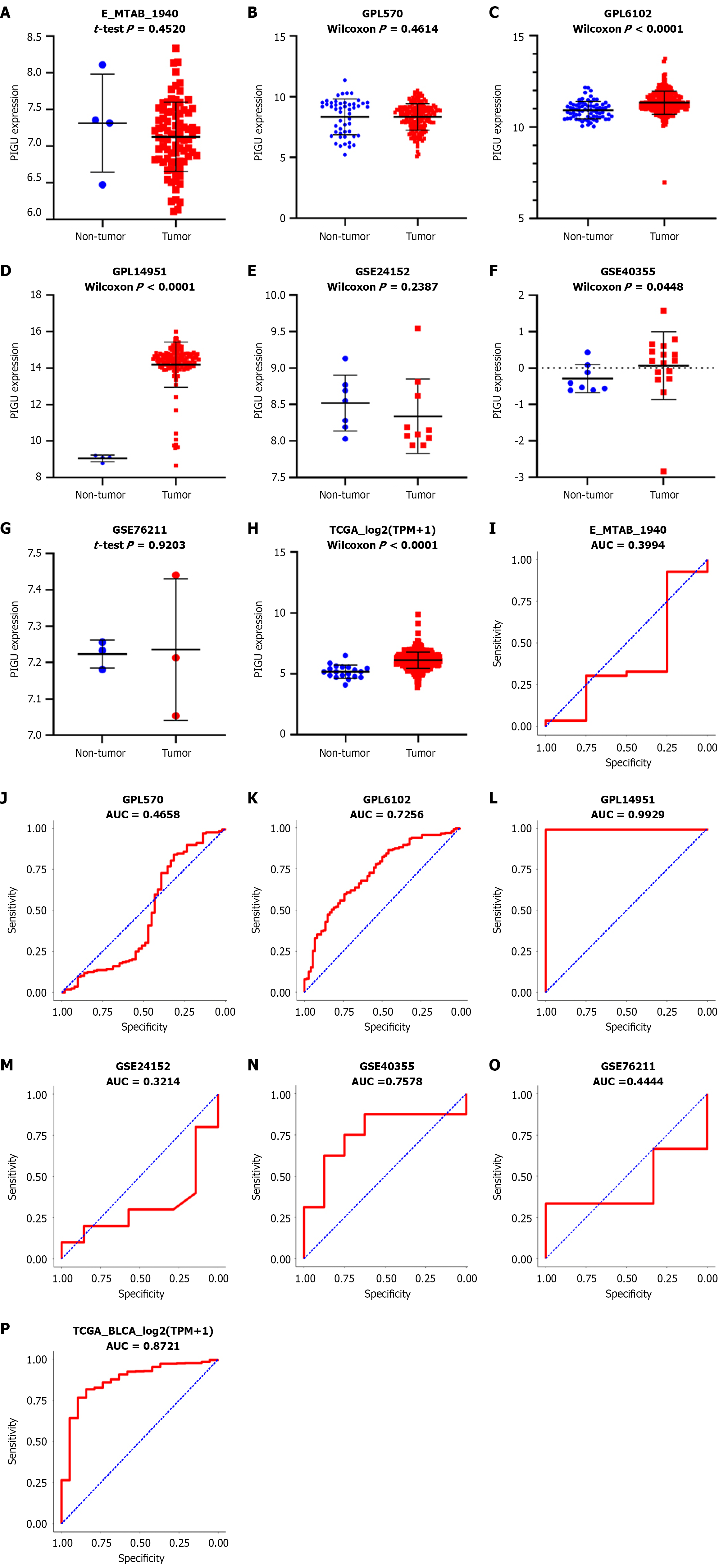 A-H: Scatter plots of PIGU expression across datasets; I-P: Receiver operating characteristic curves for PIGU in each dataset. AUC: Area under the curve.