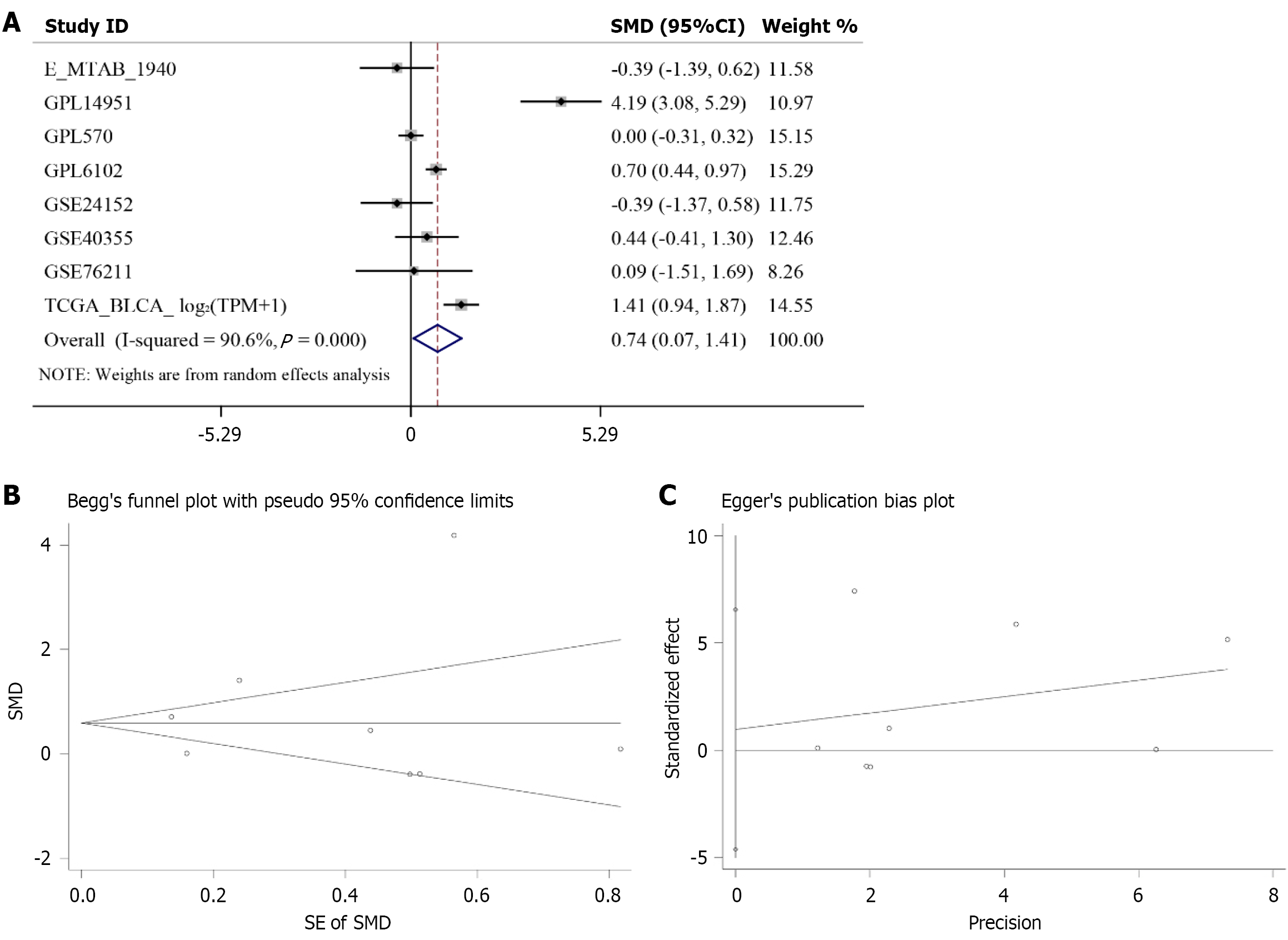 A: Standardized mean difference forest plot for PIGU; B: Begg test; C: Egger’s publication bias test. SMD: Standardized mean difference.