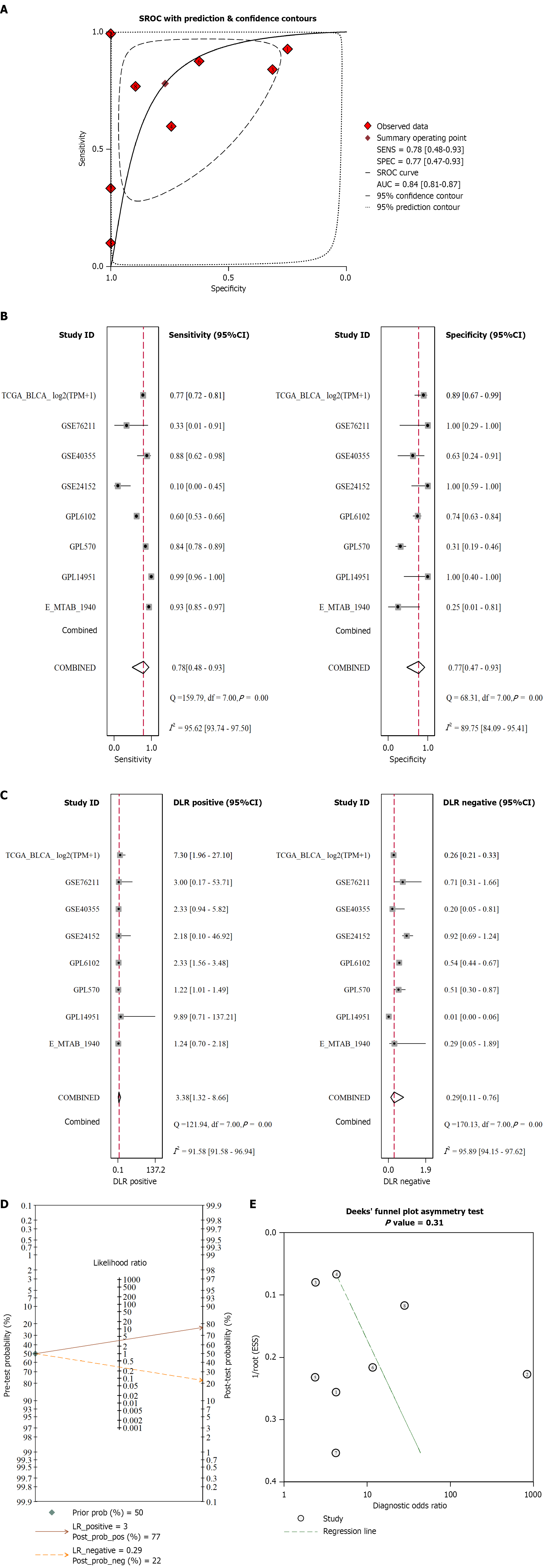 A: Receiver operating characteristic curve summary based on all included datasets; B: Sensitivity and specificity; C: Positive likelihood ratio and negative likelihood ratio; D: Fagan plot; E: Deek’s publication bias test. AUC: Area under the curve; SROC: Summary receiver operating characteristic.