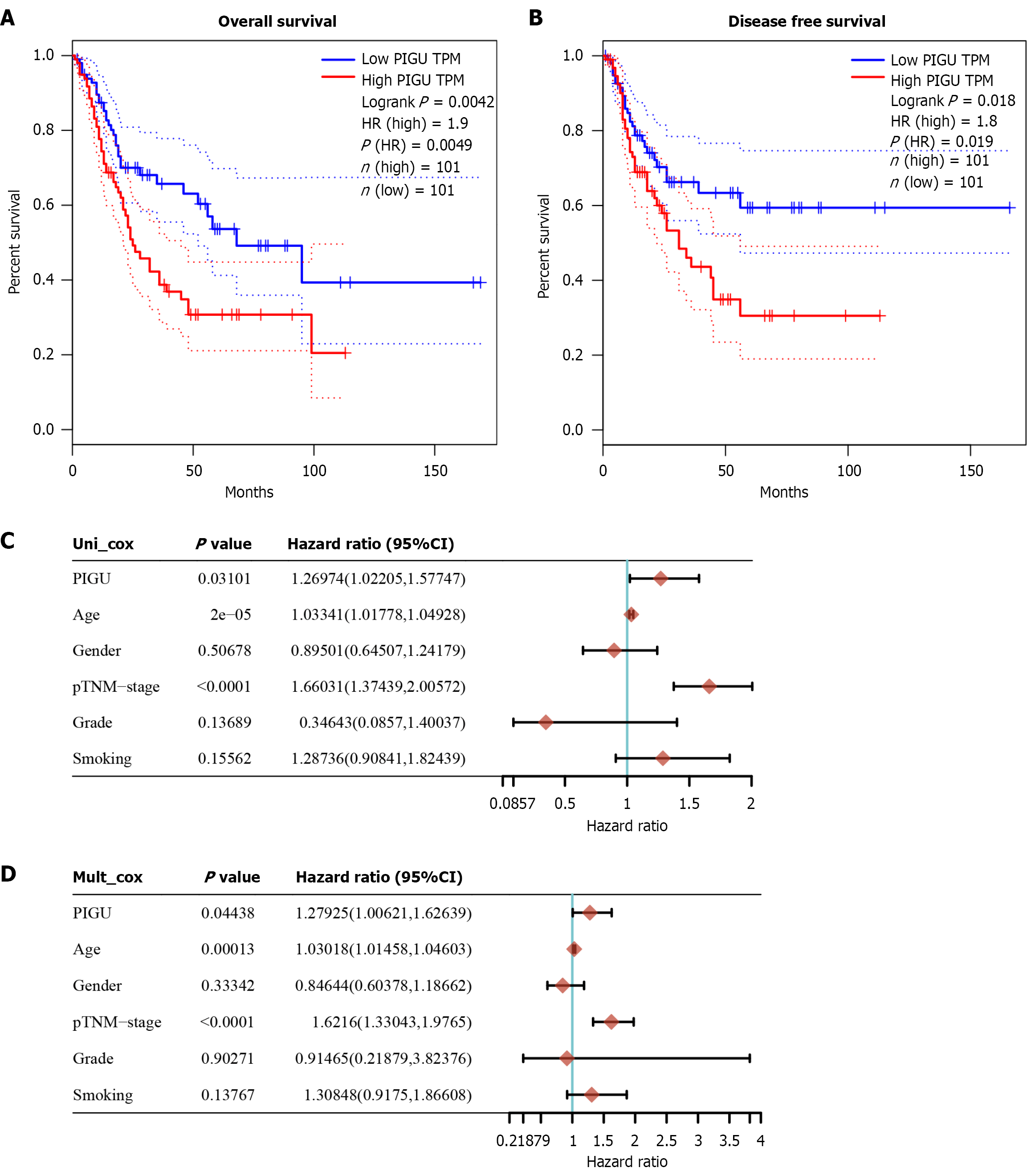 A and B: Kaplan-Meier curves for overall survival and disease-free survival in bladder cancer patients with high- and low-expression PIGU groups, where the bottom 25% represents the low-expression group and the top 25% represents the high-expression group; C: Forest plot of univariate Cox regression analysis; D: Forest plot of multivariate Cox regression analysis.