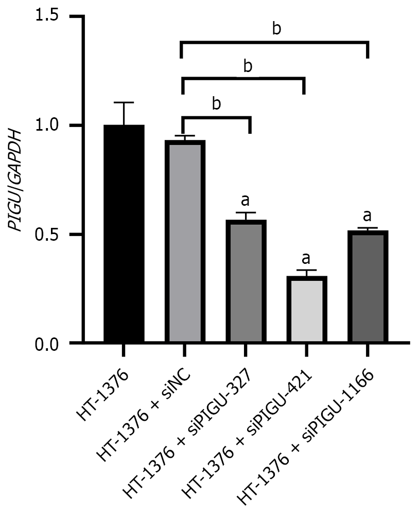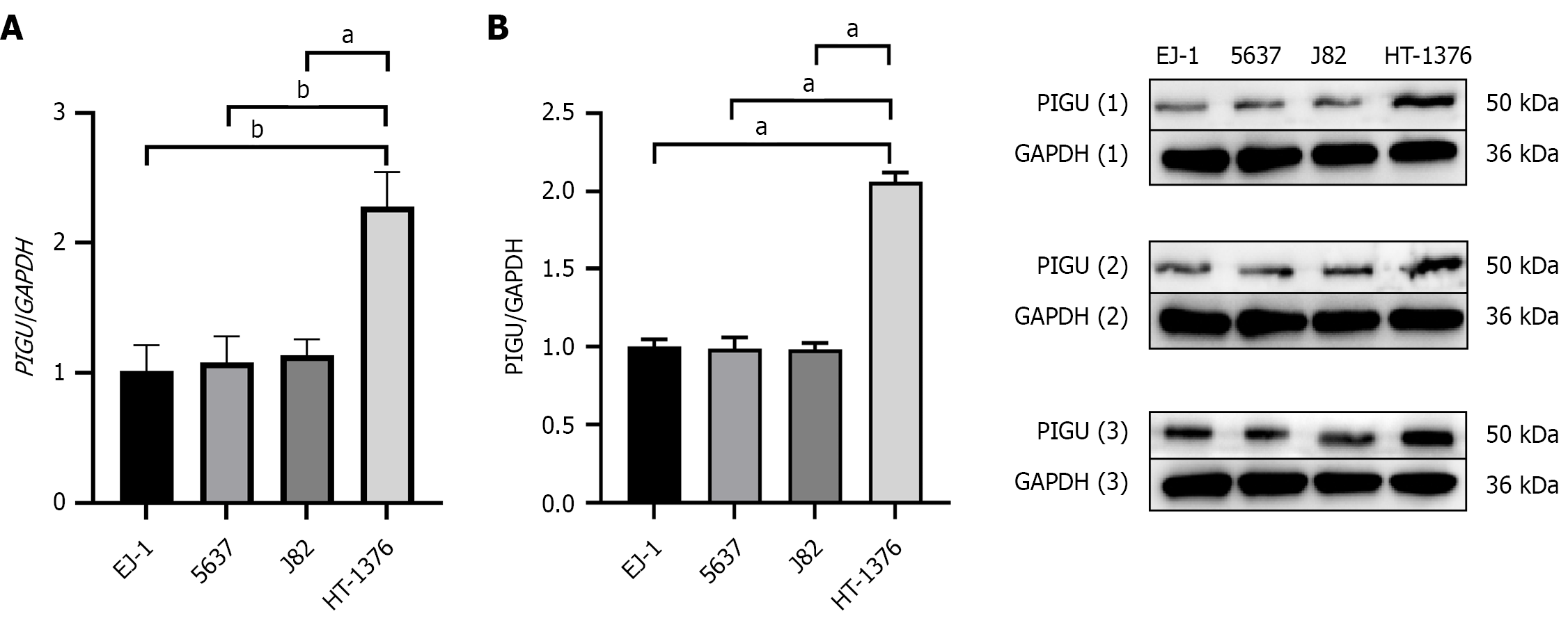 A: Relative expression levels of the PIGU gene; B: Relative expression levels of PIGU protein. aP < 0.001, bP < 0.0001.