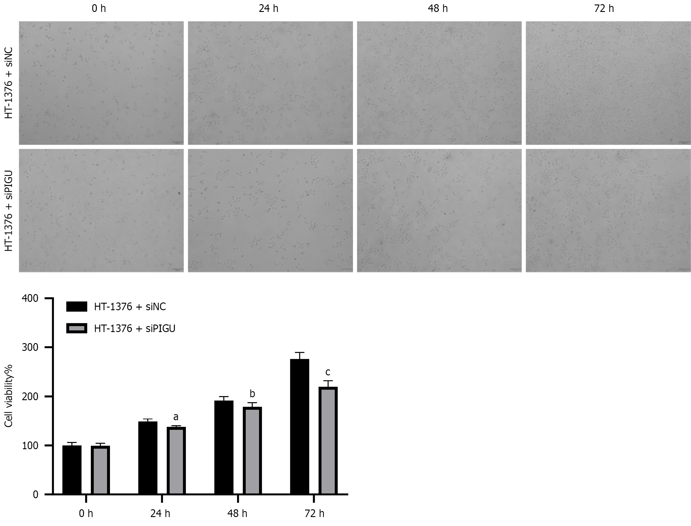 A: Experimental results for the HT-1376 + siNC group; B: Experimental results for the HT-1376 + siPIGU group. aP < 0.0001, bP < 0.001.