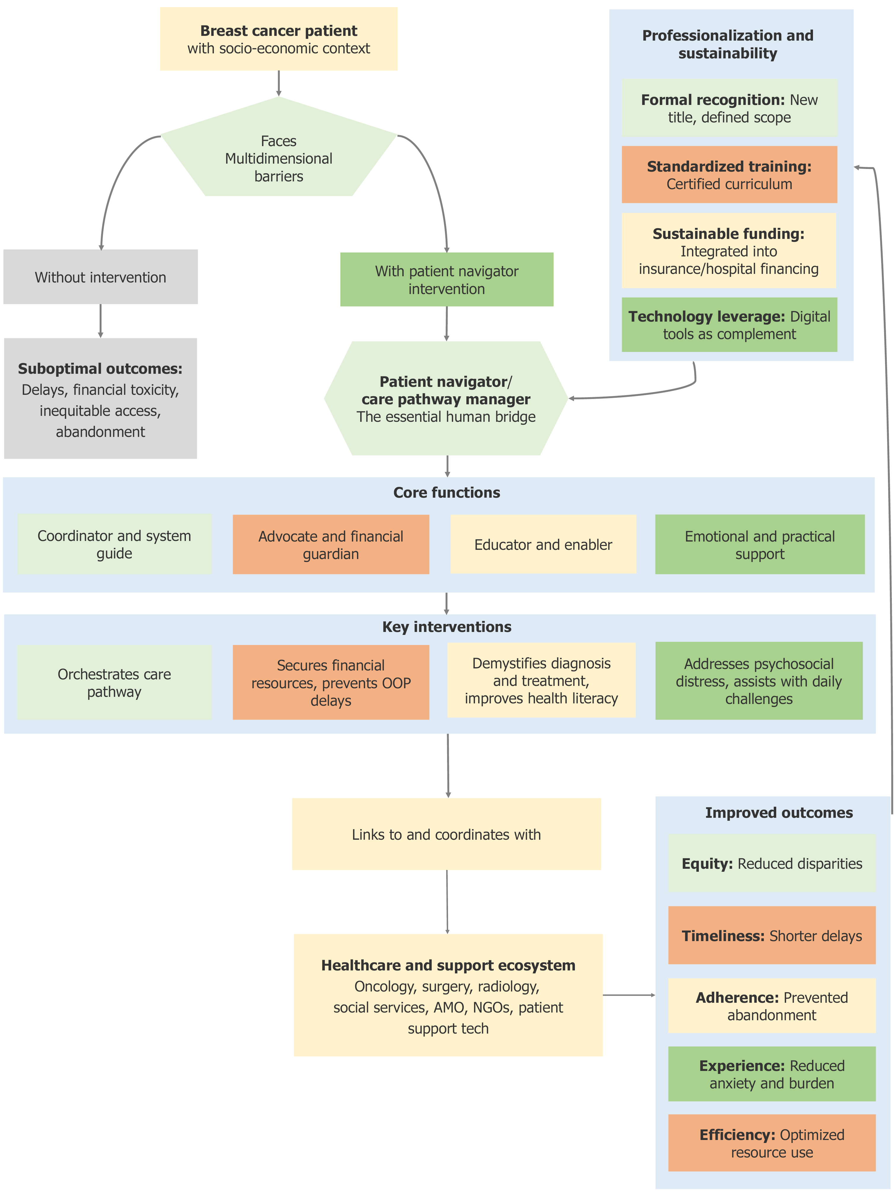 Figure 1 The transformative role of the patient navigator in breast cancer care: A systems flowchart.