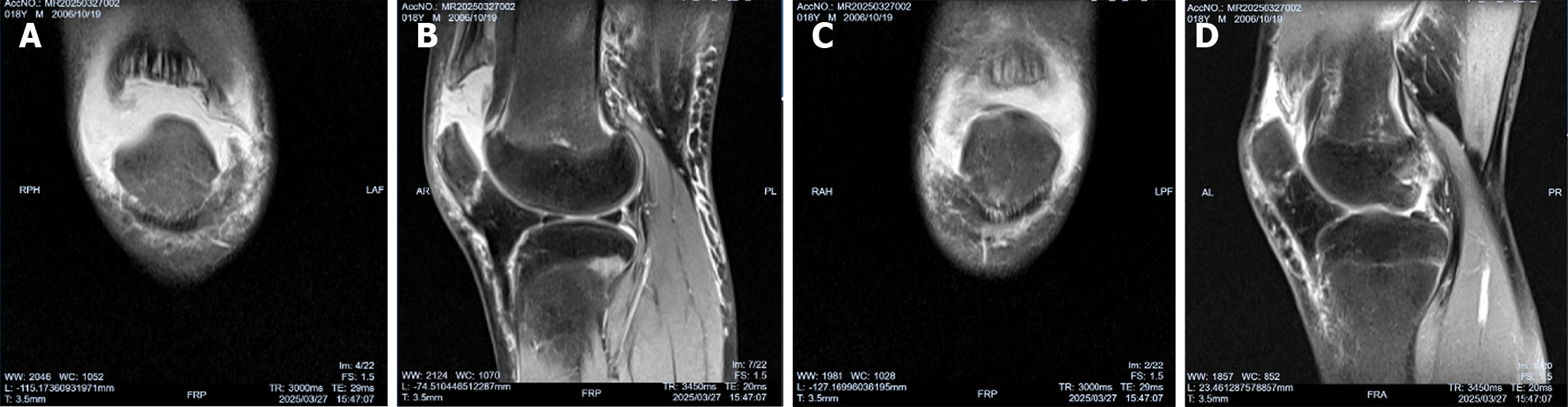 A: Coronary magnetic resonance imaging (MRI) in the right knee; B: Sagittal MRI in the right knee; C: Coronary MRI in the left knee; D: Sagittal MRI in the left knee.
