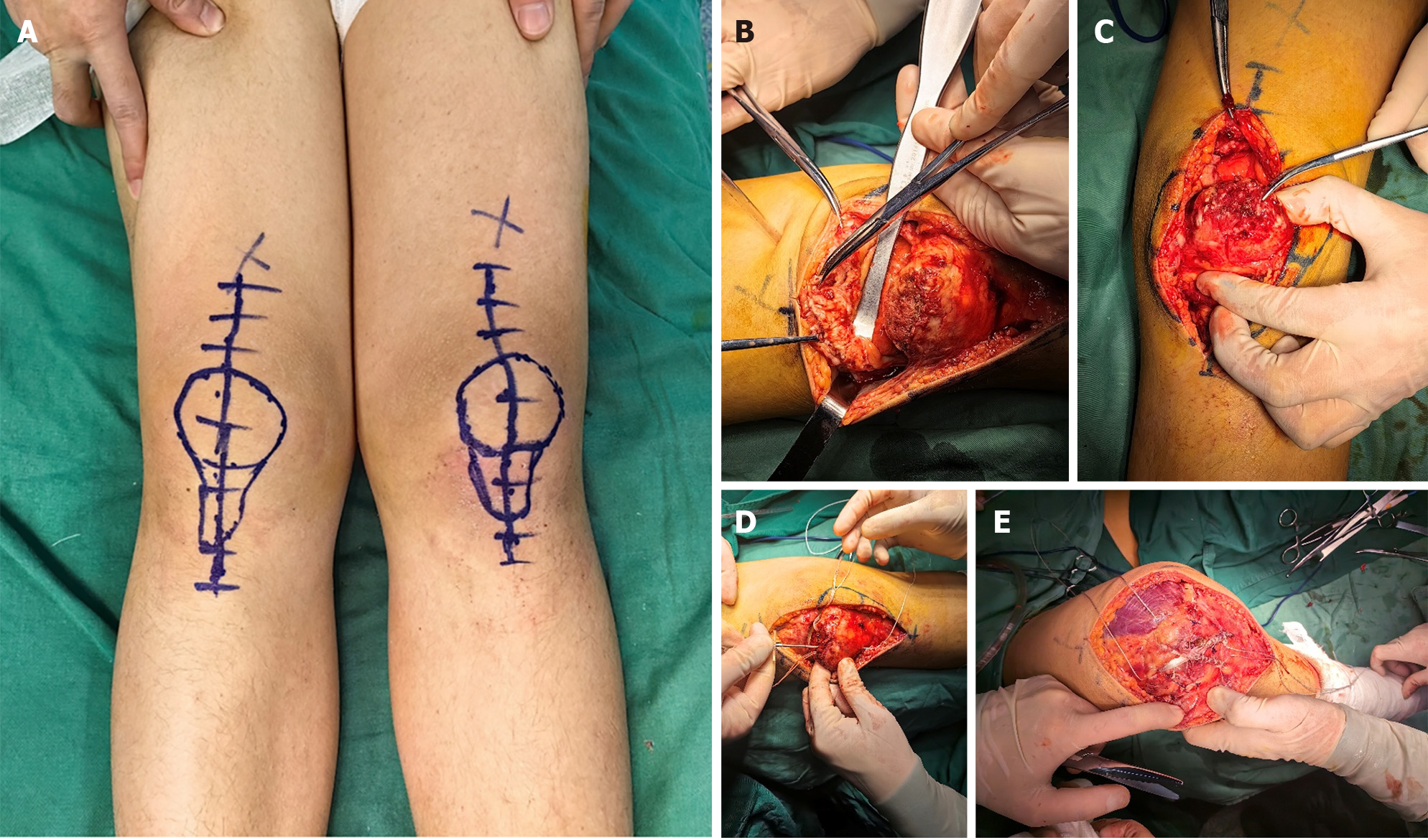 A: Patient in the supine position with an anterior approach incision in both knees; B-E: Intraoperative photographs. A thin shell of avulsed bone in the right knee (B); A thin shell of avulsed bone in the left knee (C); Two 4.5-mm suture anchors placed on the upper part of the patella in the right knee (D); The autogenous gracilis was applied to augment the stability by performing the figure-of-eight technique in the right knee (E).
