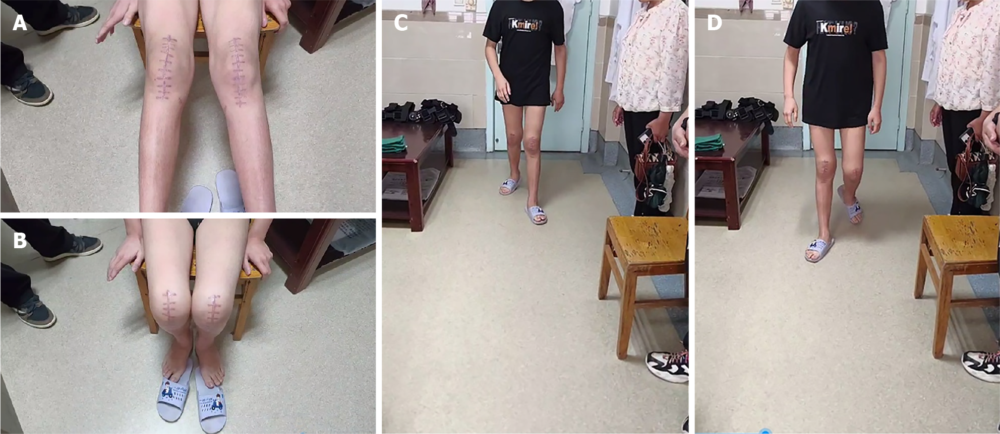 A and B: Range of motion of bilateral knee joints; C and D: Gait of the patient.
