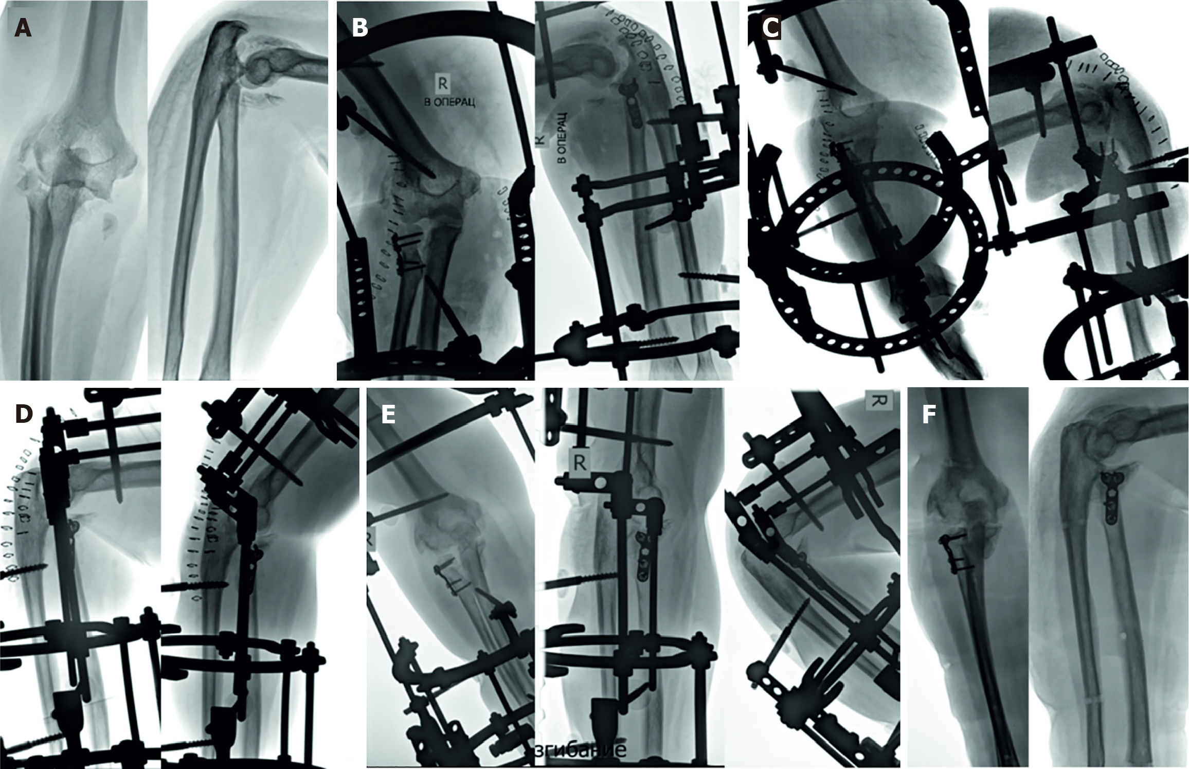 5 months in a 66-year-old patient. A: Terrible triad: Mal-alignment of the right forearm with posterolateral dislocation, radial head nonunion, coronoid process malunion, heterotopic ossification; B: Open reduction and internal fixation of the radial head and fixation of the elbow joint with the Ilizarov fixator; C: Gradual reduction of the forearm bones for 8 days; D: Placement of hinges in the axis of the elbow joint upon completion of reduction for active range of motion (ROM); E: Due to obvious ROM limitation, a distraction rod system was attached on the anterior part of the Ilizarov fixator and active ROM continued for 12 days to restore the function of the elbow joint; F: Outcome at 2 months after surgery upon removal of the Ilizarov fixator, bone union and functional recovery.
