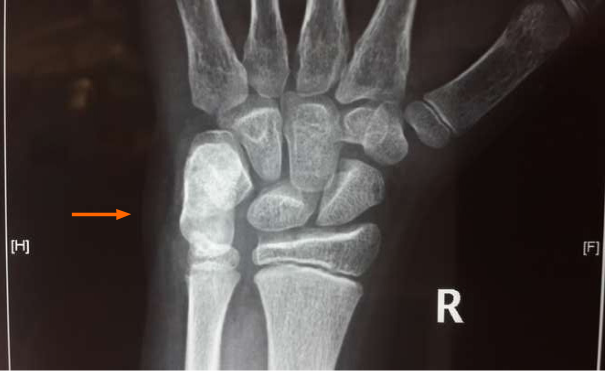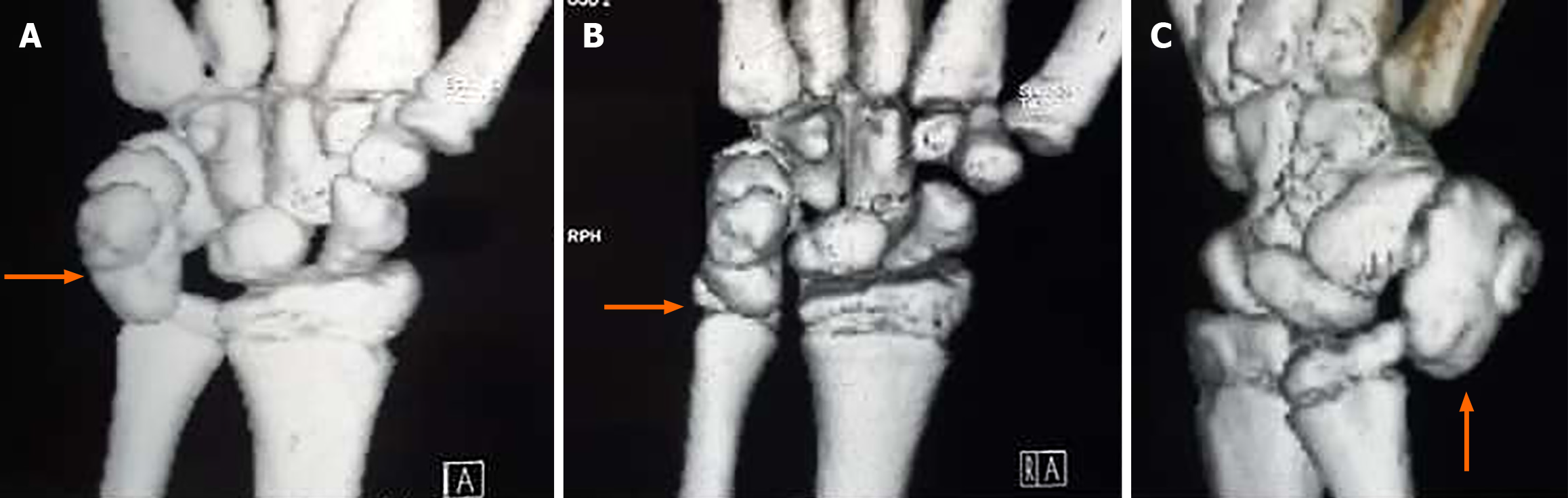 A-C: Various views of the wrist (anteroposterior and oblique) and the orange arrow pointing the lesion.