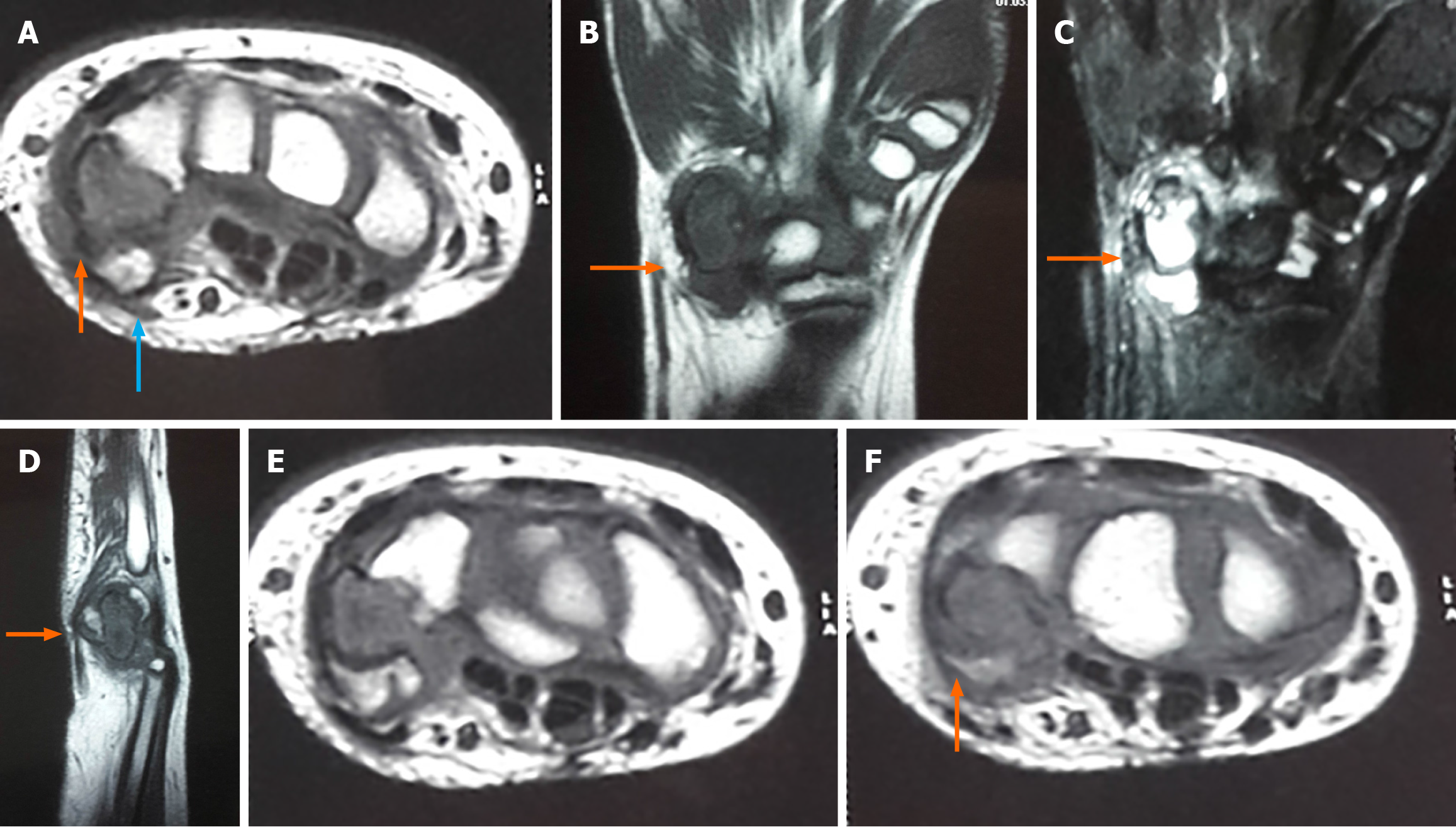 A-F: T1 coronal with hyointense lesion marked (B); T2 coronal with oedema of the pisiform and triquetrum without adjacent soft tissue infiltration marked (C); T1 sagittal with hypointense lesion marked (cartilage caps are hypointense in T1) (D); T1 axial with hypointense lesion marked and ventral isointense lesion suggestive of pisiform (orange arrow) with dorsal lesion (blue arrow) (A, E and F).