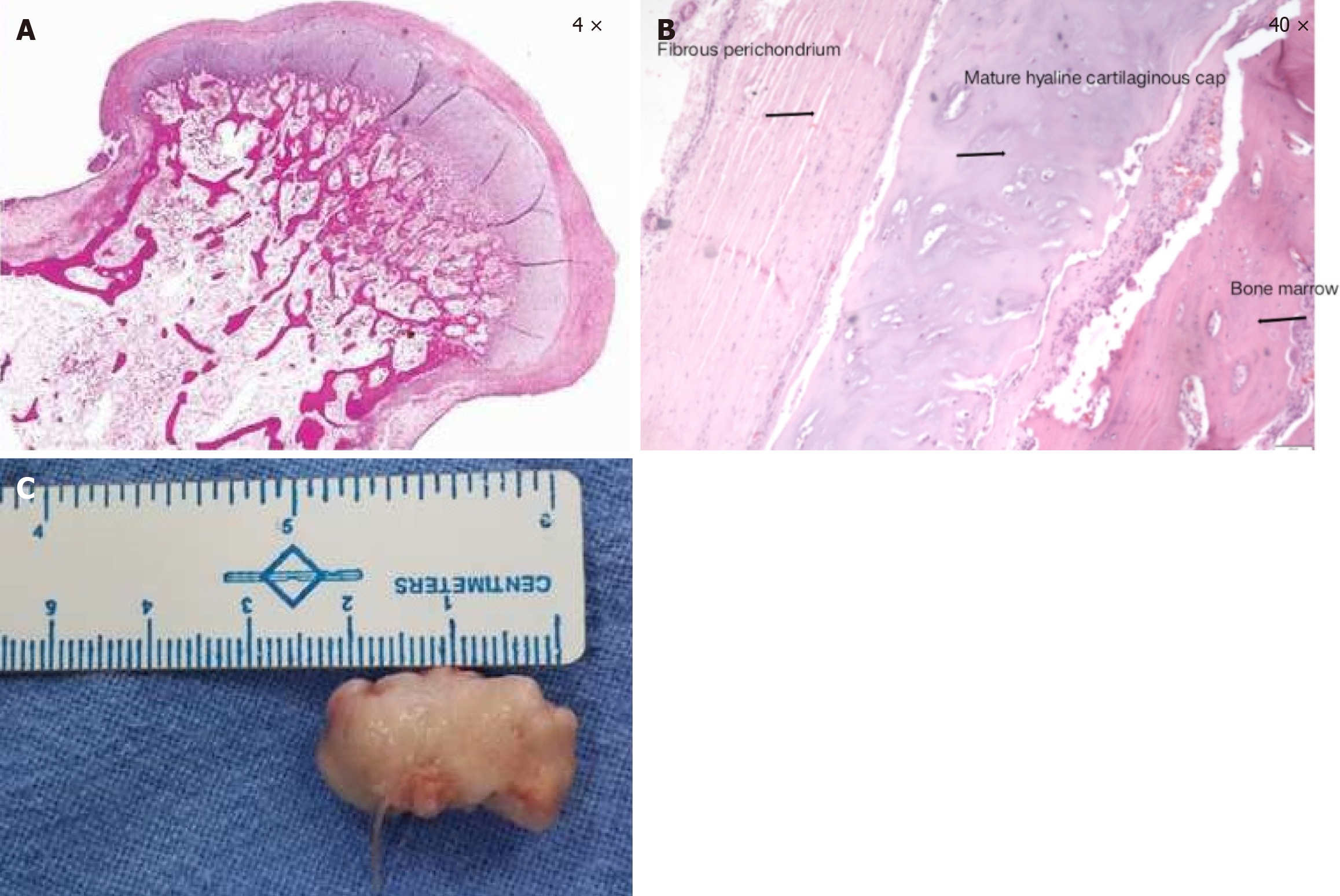 A and B: Histopathological examination, 4 × (A) and 40 × (B); C: The excised pisiform with osteochondroma.