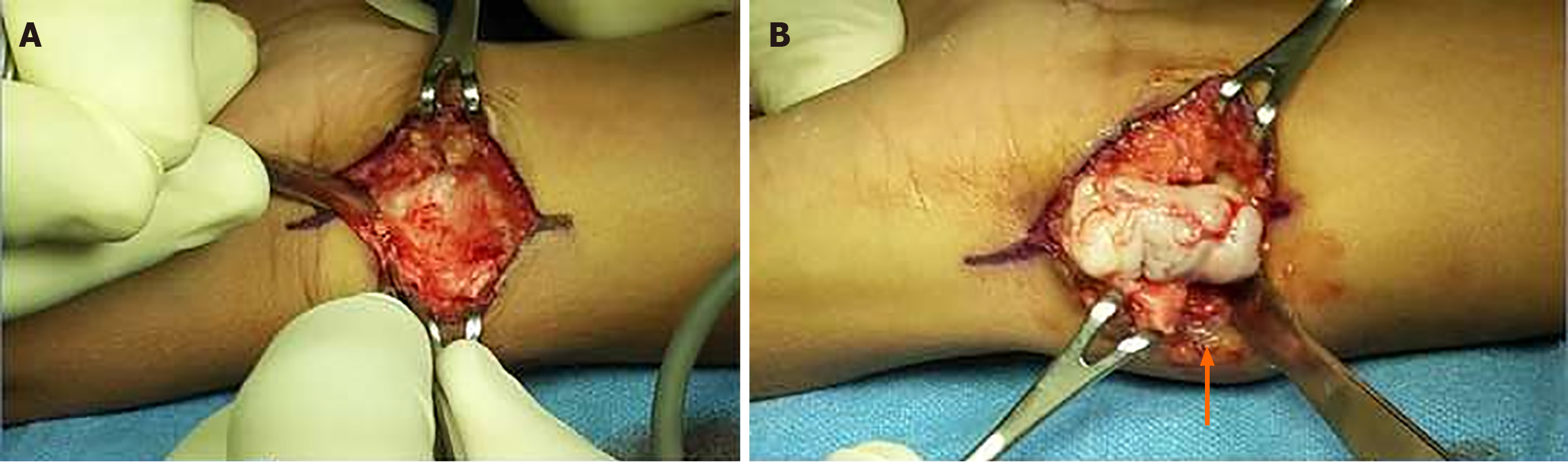 A: The flexor carpi ulnaris tendon was identified and retracted radially; B: Underlying osteochondroma.