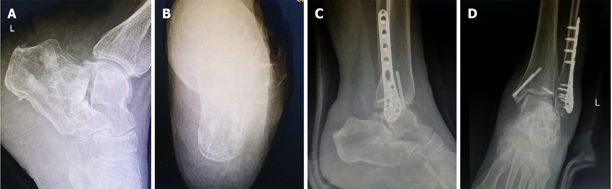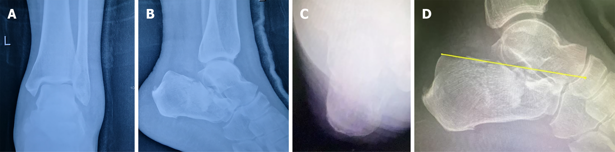 A and B: Anteroposterior (A) and lateral (B) views of the ankle; C: Axial view of the calcaneus; D: Böhler angle was 0°.