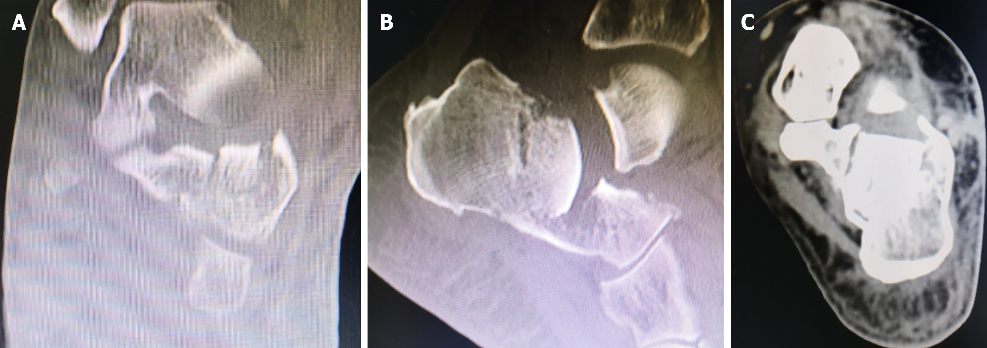 A: Sanders type IV calcaneal fracture; B: Böhler angle was 0°; C: Mild calcaneal widening.