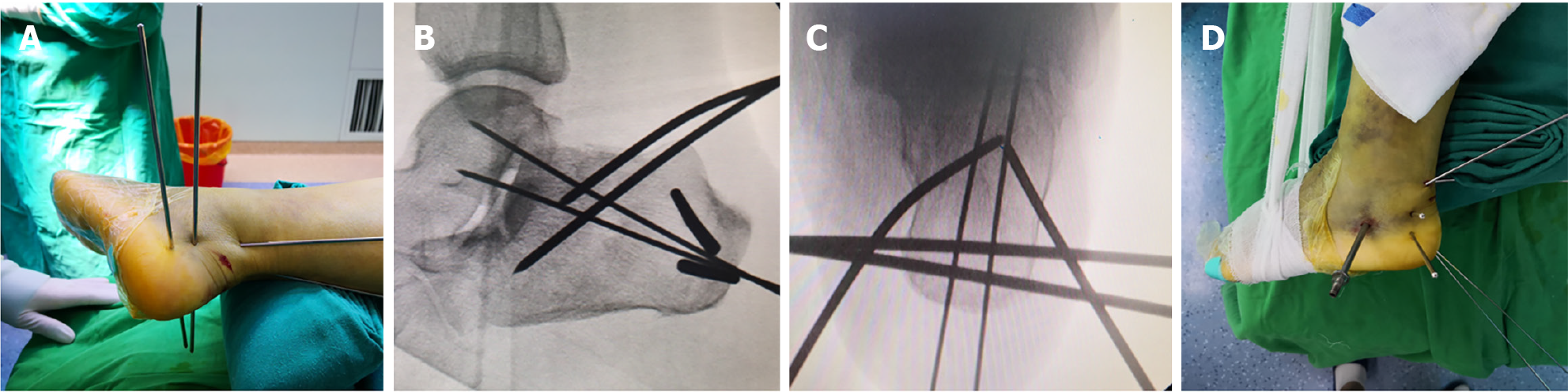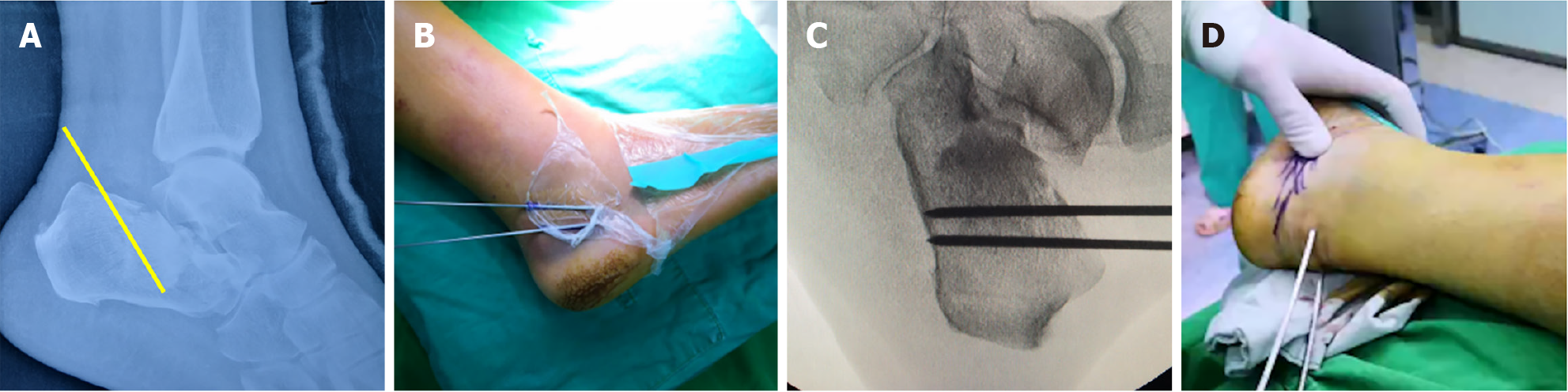 A: The preoperative plan specified a 40° prying angle with the entry point at the anterior margin of the calcaneal tuberosity. The tip of the Steinmann pin was positioned at the deepest point of the depressed fracture fragment; B: Two 2.0 mm Kirschner wires were placed superficially to simulate the intended trajectory and depth of insertion; C: Two 3.0 mm Steinmann pins were then inserted into the calcaneus with approximately 1.5 cm spacing between them, following the trajectory established by the superficial Kirschner wires; D: Fluoroscopic imaging confirmed satisfactory positioning of the superficial Kirschner wires.