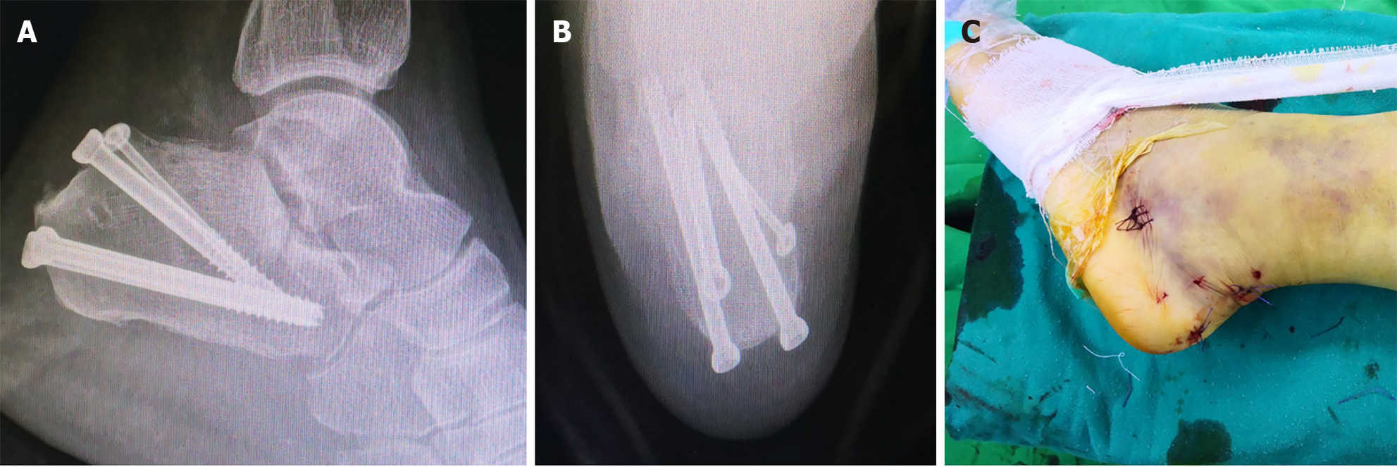 A and B: Fluoroscopic lateral (A) and axial (B) views demonstrating percutaneous screw fixation of the calcaneus; C: Photograph of the minimally invasive surgical incision.