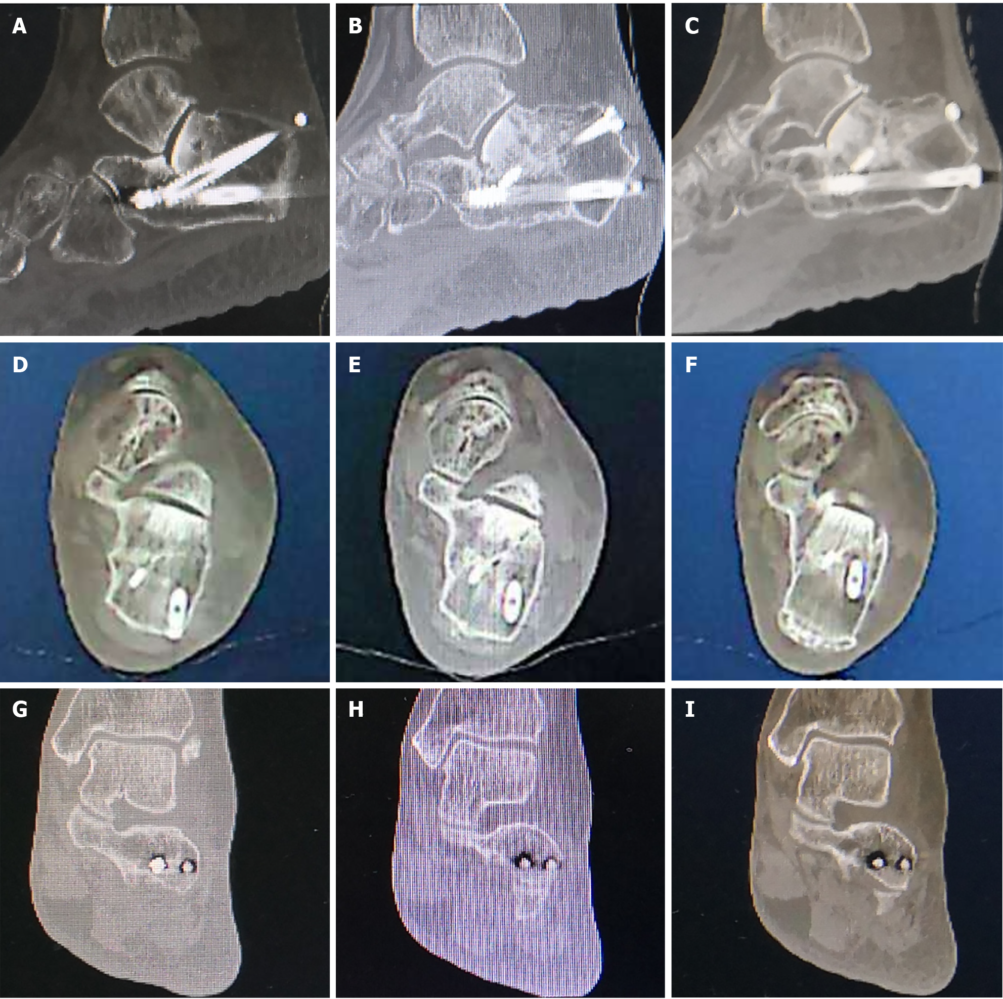 A-C: The Böhler’s angle was maintained at 22°; D-F: The calcaneal width was essentially restored to normal width; G-I: The subtalar joint surface demonstrated satisfactory reduction with restored articular congruity.