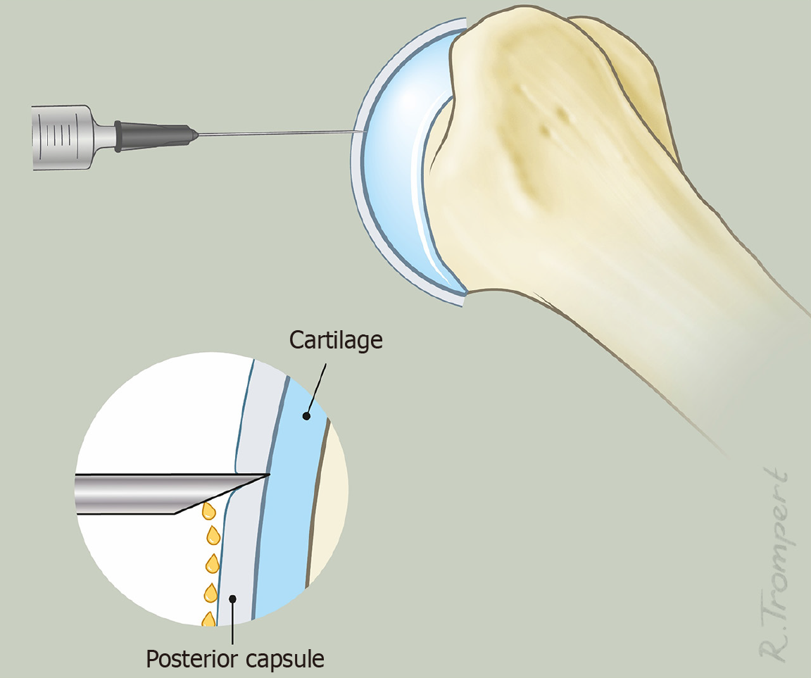 A: Position of the needle with the arm in maximal medial rotation. The needle has passed the capsule perpendicularly. Notice that a part of the opening of the needle is still outside the capsule; B: After a small lateral rotation, the bevel of the needle has been pulled under the capsule into the joint. Notice that the tip of the needle is in contact with the cartilage, but does not change its position with respect to the cartilage during the rotation.
