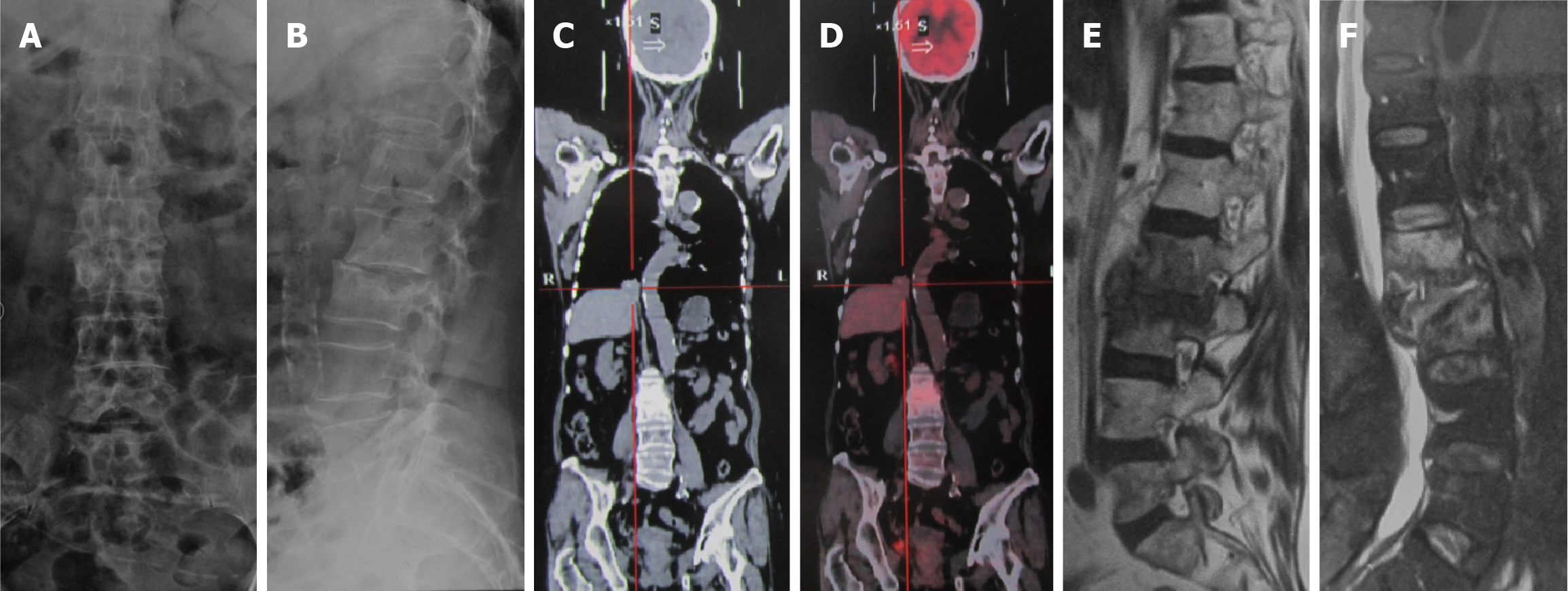 A and B: Visible destruction of the L2 and L3 vertebral bodies, with narrowing of the L2/L3 space; C and D: Positron emission tomography/computed tomography suggest bone metastasis of lung cancer to the L2 and L3 vertebrae; E and F: Magnetic resonance imaging indicates increased signals in the L2 and L3 vertebral bodies and intervertebral space.