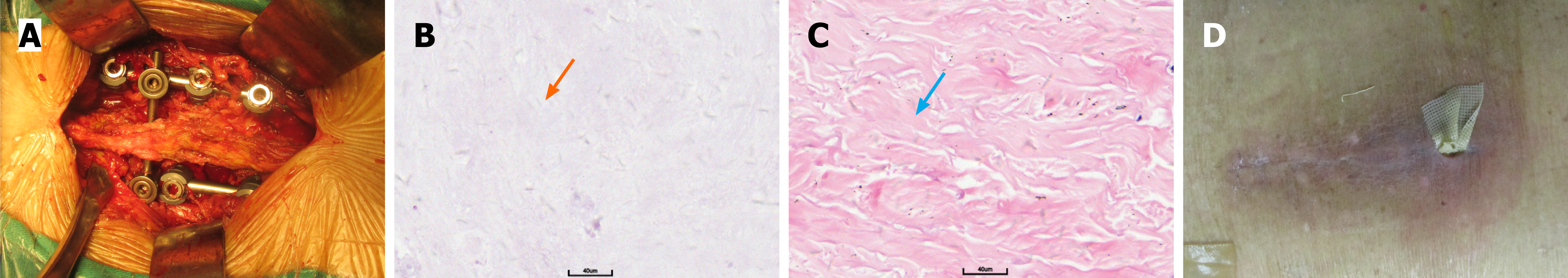 A: Internal fixation during surgery; B: Postoperative case with intervertebral bone tissue, fibrous tissue, and necrotic tissue. The orange arrow points to the site of the lesion; C: Postoperative case with obvious proliferation of dermal sclerosis fibrous scar tissue accompanied by necrosis, suggesting chronic radiation dermatitis. The blue arrow points to the site of the pathology; D: Lower end of the incision was not healing, accompanied by inflammatory exudate.