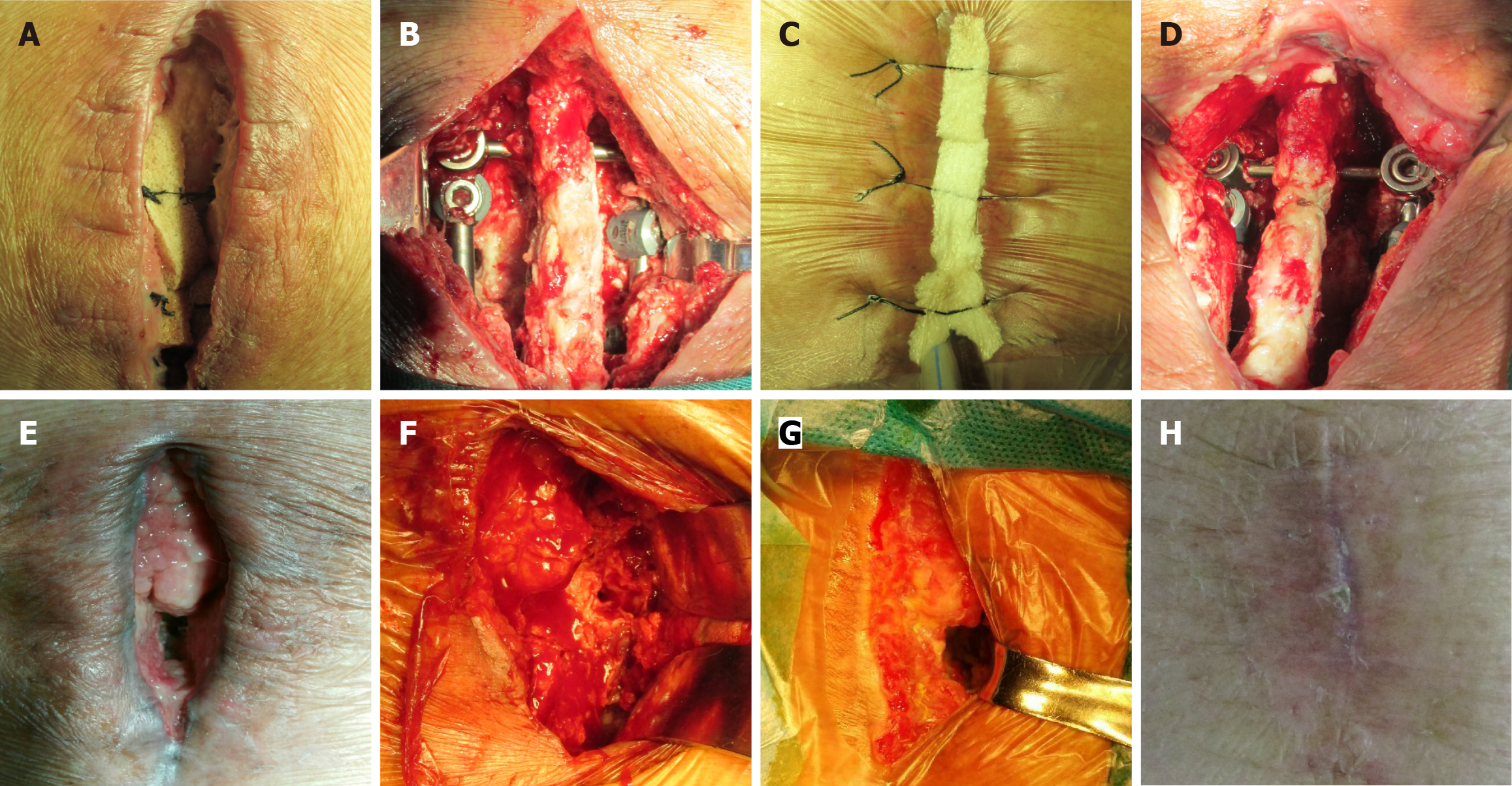 A: Initial vacuum sealing drainage (VSD); B: Fresh wound after initial VSD surgery with residual necrotic tissue; C: Sixth application of VSD; D: Fresh wound (5 weeks post-surgery); E: Healing on the left side after the eighth application of VSD, but the right side remained unhealed (7 weeks post-surgery); F: Removal of the right internal fixation (8 weeks post-surgery); G: 11th application of VSD (9 weeks post-surgery); H: Wound healing after 12th application of VSD.