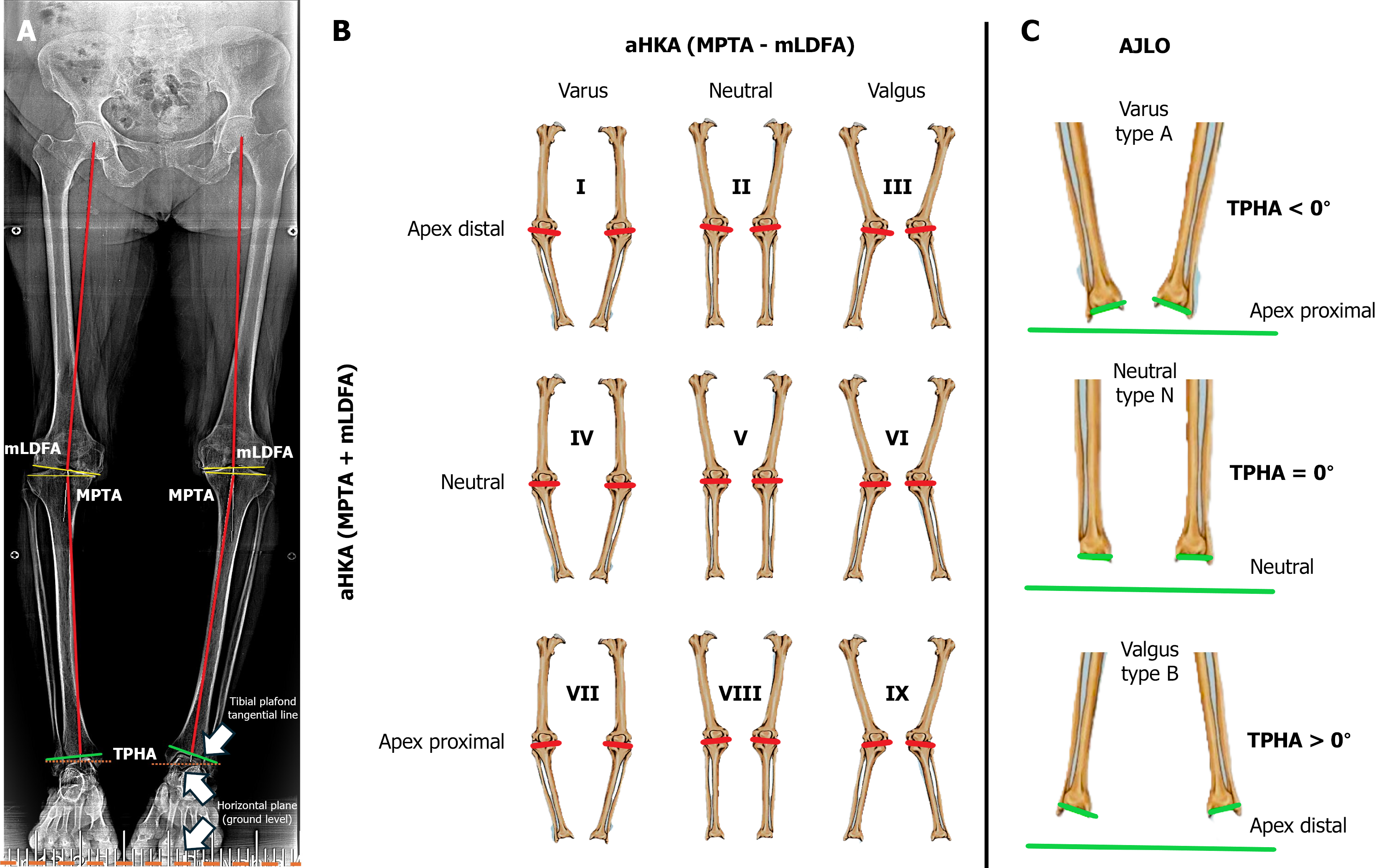 A: Long-leg, standing anteroposterior (hip to knee to ankle radiograph showing how mechanical lateral distal femoral angle, medial proximal tibial angle, and tibial plafond horizontal angle were measured; B: Schematic representation of the coronal plane alignment of the knee classification following MacDessi et al[5] description; C: Ankle joint line orientation directions and types. mLDFA: Mechanical lateral distal femoral angle; MPTA: Medial proximal tibial angle; TPHA: Tibial plateau horizontal angle; aHKA: Arithmetic hip, knee, and ankle; AJLO: Ankle joint line orientation.