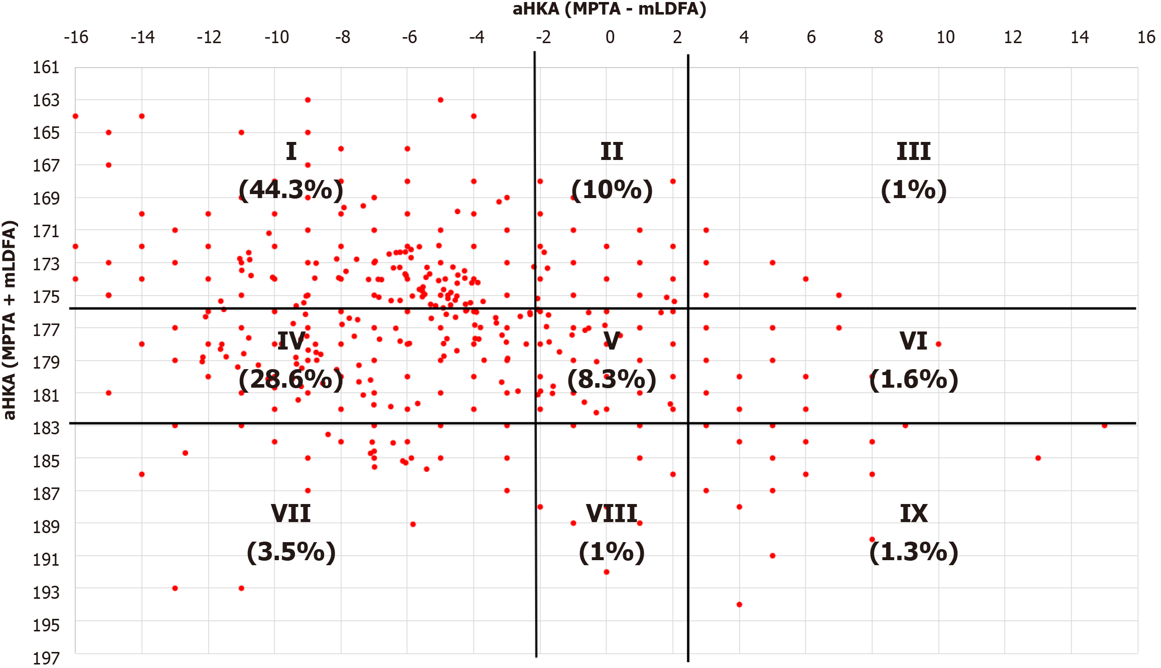 Figure 2 Scatterplot of knee joint line orientation against arithmetic hip, knee, and ankle (aHKA) showing distribution by percentage of the nine coronal plane alignment of the knee phenotypes.